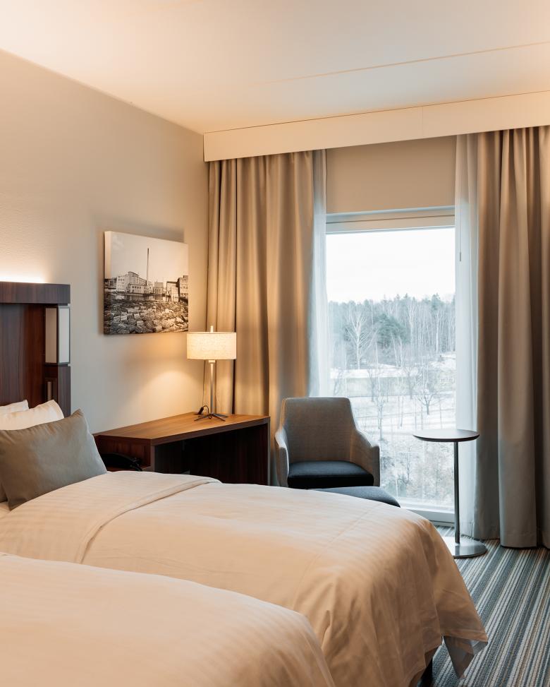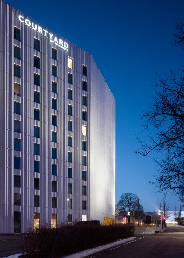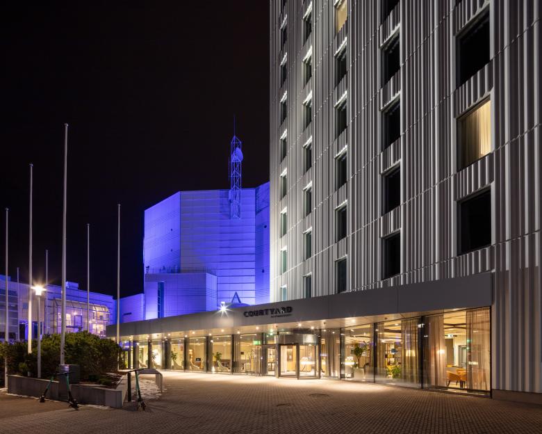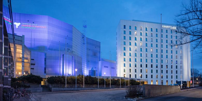 The new Courtyard by Marriott Hotel with 11 above ground floors is a high-quality addition to the Tampere cityscape. The hotel and its next door neighbor, the Tampere Hall Concert and Congress Centre, comprise a formal yet natural architectural entity. The hotel also strengthens the connection between Tampere Hall and the main building of the University of Tampere on the opposite side of the street.