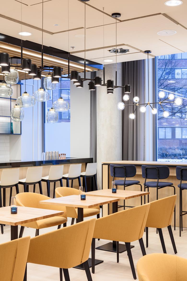 Functionally the new building is clear and simple. The reception, a 24/7 mini market, a multi-functional restaurant space, a business center and a gym are located by the hotel entrance. The rooms contain all the essential features that business travelers need. The spa-like bathrooms are light and airy. The floor-to-ceiling windows provide the hotel rooms with enticing views of the surrounding cityscape. The guests staying in the rooms located on the upper-most floors will even be able to take in views of the wider urban area.