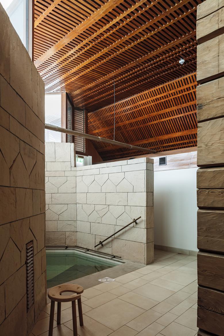 The building’s most significant architectural feature, its roofs resemble the forms of the snowy Lake Kitkajärvi near Kuusamo, Northern Finland. The facades are made of locally manufactured natural sandstone tiles, white plastered bricks and white painted concrete with wooden parts of oiled teak.