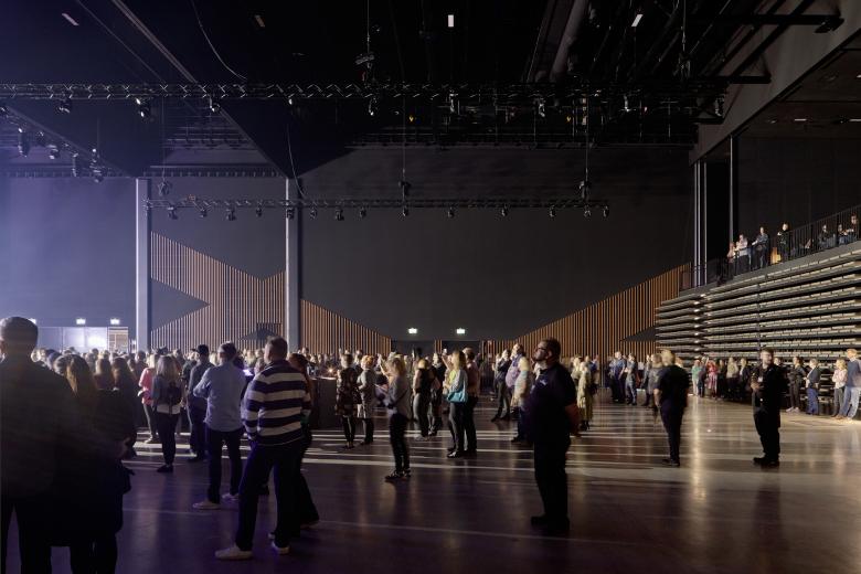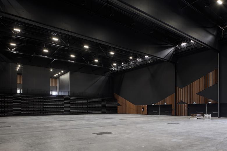 The 7,700 SqM structure consists of only two main parts: a large rectangular hall volume and a hanging roof peeling away from the hall, thus creating a foyer underneath. Both the hall and the roof are solid wood, weatherproofed with zinc cladding. The hanging roof is supported by curved glulam beams fully in tension. The curve of the roof is structurally optimized as to allow for as thin beams as possible, while keeping the foyer free of columns. The acoustically dampened black hall can be almost endlessly modified for different uses with movable partition walls, retractable seating, curtains and lighting. The wooden modulations on the walls visualize the possible variations in seating layouts. Support facilities line the hall on three sides. The window openings of these facilities are shaded by zinc fins.