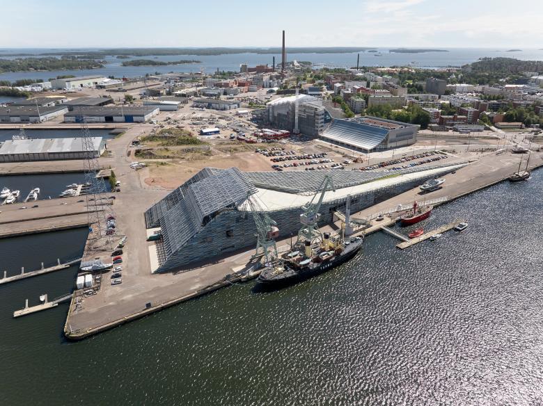 The newly opened Event Centre Satama is located in Kantasatama, the oldest port of Kotka, just a couple of steps from the impressive Maritime Centre Vellamo, which has been standing in the port area already for 15 years. The events center shares its lot with the new campus building of the South-Eastern Finland University of Applied Sciences, currently under construction, and a future hotel. This trio of new buildings will aid in strengthening both the visual and the functional connection between the port and the city center.