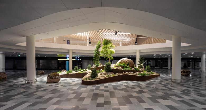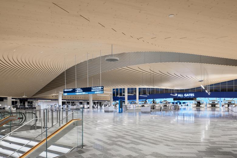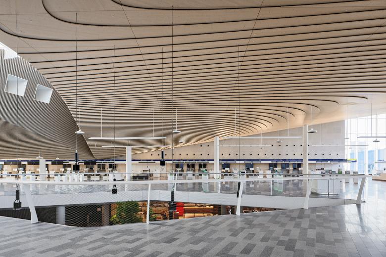 The imposing departures hall is designed as a continuous space decked by an undulating timber ceiling, the underside of which is like an upside-down version of the topography one sees when looking out a plane window. The lower level of the building is used by arriving passengers, as well as by everyone coming to the terminal by bus, train, bike or foot and those coming from the parking facilities. By 2023, the airport's baggage reclaim functions will be efficiently combined into one single hall. Large openings in the departures hall floor visually link the two levels. The overall design follows the airport’s strategy of having all facilities under “one roof” so that transferring passengers can swiftly walk between the gates.