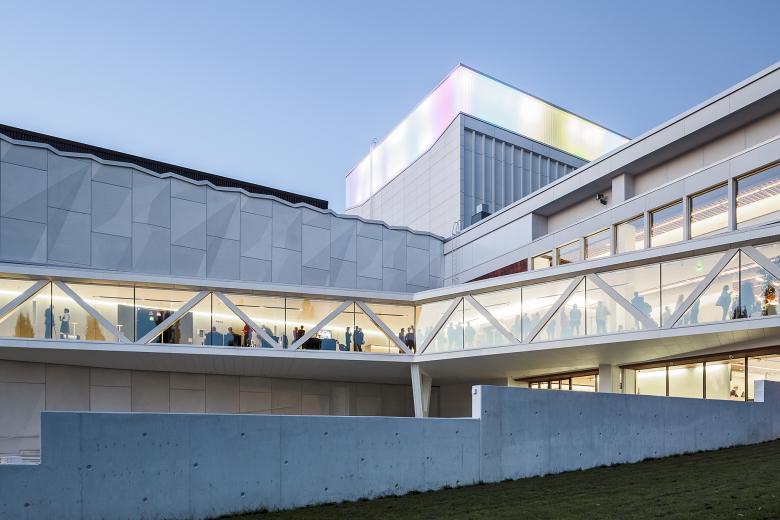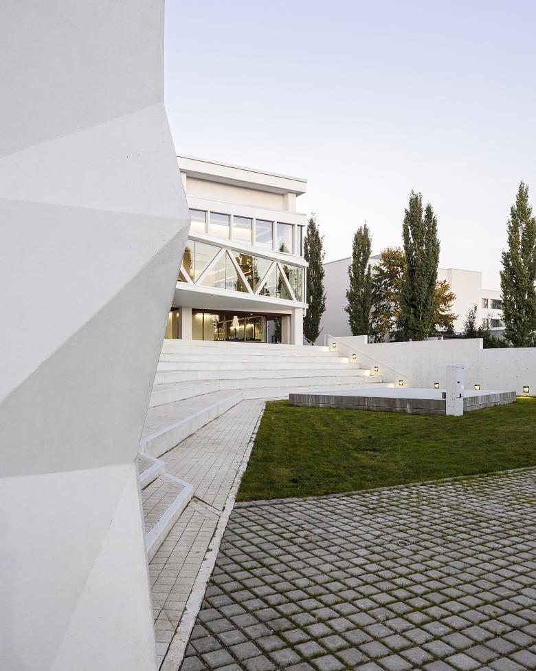 The old building has a beautiful and timeless material palette consisting of white concrete panels, terracotta tiles and glass. To mirror these materials, the extension is clad in white fiber concrete panels with a wrinkled, varying surface form, which indicates a similar acoustically optimized cladding inside the new hall. Also the new interior spaces follow the original color scheme.