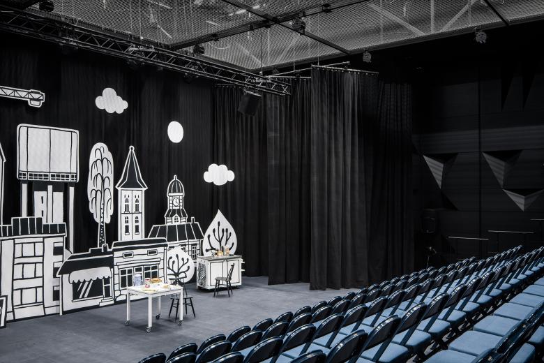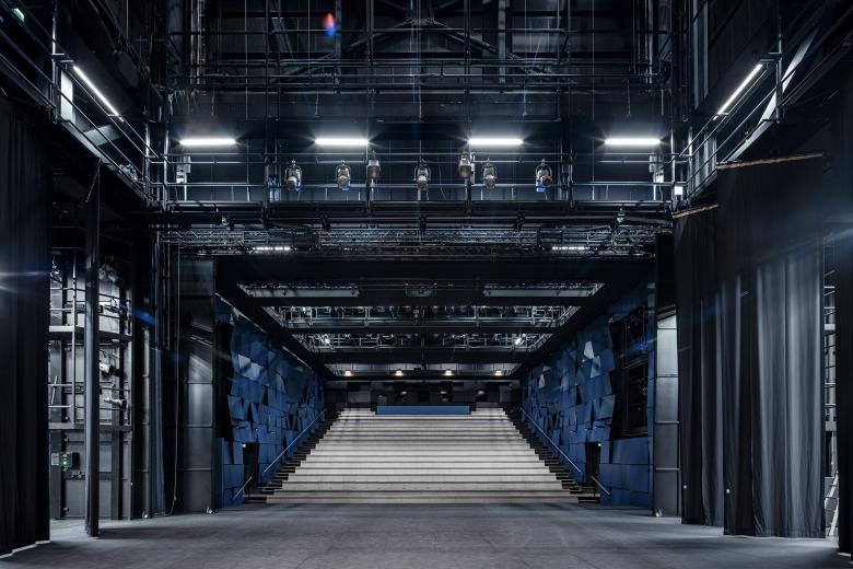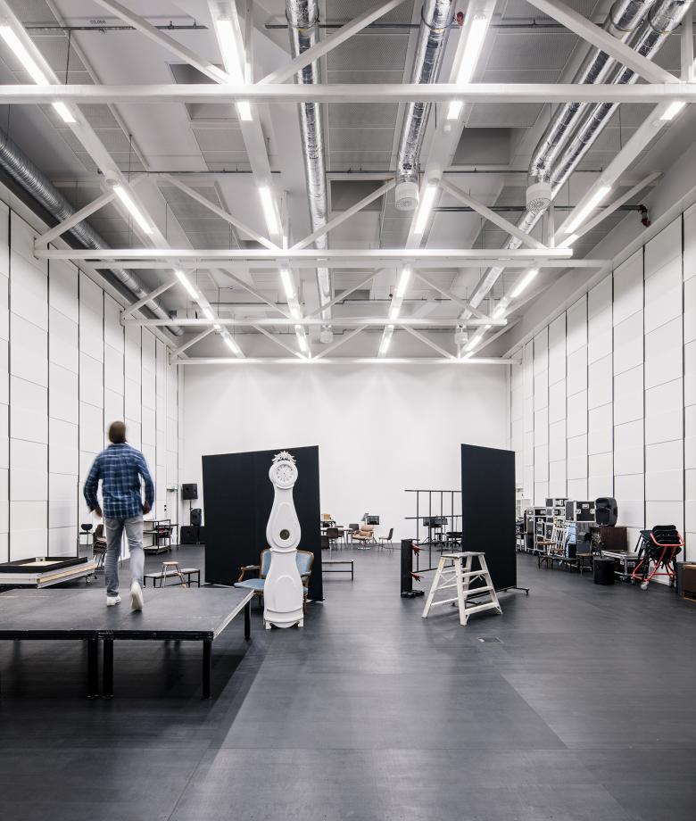 Virtually all the facilities of the theater are on stage level. This is the ideal situation as all actions are directed towards the stage. The stage sets are brought from the basement loading dock to the center of the workshop with a large lift. After assembly, the sets can be pushed directly onto one of the stages or into the full-size rehearsal hall. The support spaces outline the halls in a linear procession from the spaces for the technical personnel onwards to props, costume shop and the dressing rooms. This means that the entire theater only has one single corridor instead of the usual incoherent jungle of backstage spaces. The solution also provides all backspaces with ample daylight, which is of great importance for the professionals working on and around stage.