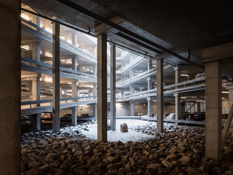 The new five-cornered, five-story-tall Saukonlaituri parking facility consists of six circuits of parking for 600 private cars around a landscaped central courtyard with boulders, moss and ferns, totaling 20,000 square meters. Five of the circuits are covered and the sixth one is located on the roof. The courtyard has a double function: it both forms a light-well bringing daylight down to the lower parking circuits and serves as a storm water retainer and snow deposit. The southern side of the building falls back from the entrance square, stretching the ground level public space as a terraced park all the way up to the roof. This solution allows the residents of the surrounding apartment blocks to access their cars by hiking up the terraces to the correct floor instead of taking the elevator there. The terraced area can also be used for picnics and sunbathing.