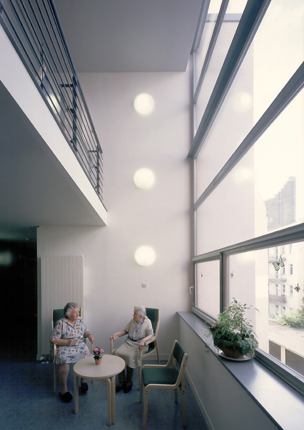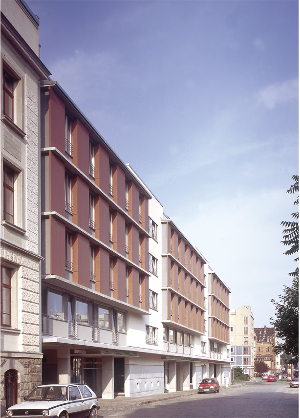 Die Altenpflegeeinrichtung an der Seeburgstraße in Leipzig liegt am Innenstadtring unweit des Gewandhauses, in einer Brachfläche mit Bruchstücken der Kriegszerstörung und des stereotypen Plattenbaus der ehemaligen DDR . Der städtebauliche Entwurf zielt auf eine Rekonstruktion der Stadt des 19. Jahrhunderts mit Blockrandbebauungen und gefassten Straßenräumen. In der Altenpflegeeinrichtung leben über 100 Menschen, weitere 50 ältere Menschen werden ambulant betreut. Demensprechend gliedert sich die große Baumasse in drei Teile, um sowohl im städtebaulichen Gefüge als auch in der inneren Orientierung eine maßstäbliche Strukturierung zu erreichen. Diese Dreigliederung ist Taktgeber für alle strukturellen Entwurfsentscheidungen. Zwei Sonderelemente verknüpfen sich mit Geschichten der Stadt und der Bewohner. Die Vorschrift der sogenannten „Leipziger Mansarde“, eine Anlehnung an die Pariser Mansarde wird als lichtdurchfluteter Aufenthaltsbereich im Dachgeschoss interpretiert. Die Sehnsüchte der älteren Bewohner nach Masurischen Landschaften, die in Gesprächen immer wieder zum Thema wurden, spiegeln sich in Motiven von Birkenwäldern, die überall im Haus gestalterisch umgesetzt werdn konnten.