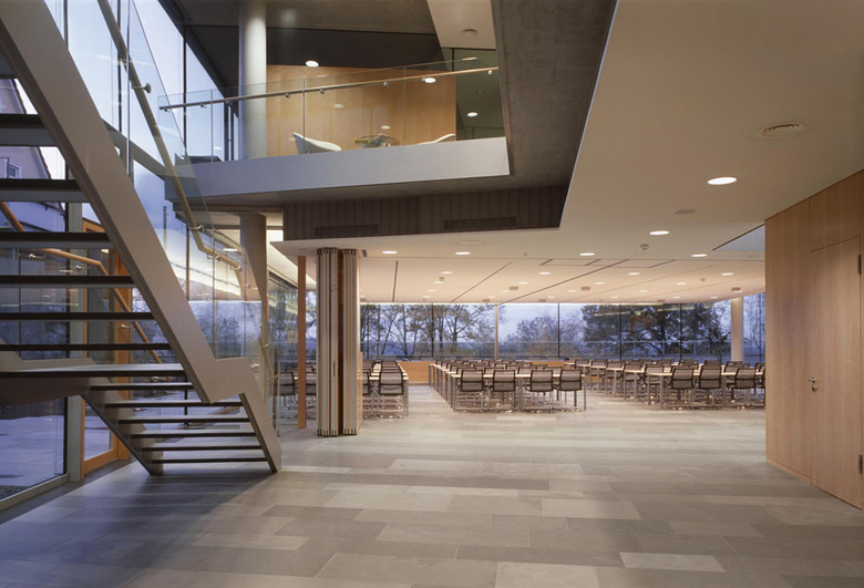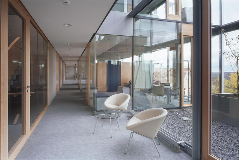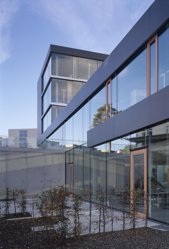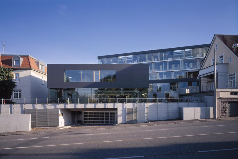Der Neubau der Bezirksärztekammer Nordwürttemberg in Stuttgart-Degerloch bietet Mitarbeitern und Mitgliedern der Berufsvertretungsorganisation den maßgeschneiderten, idealen Rahmen für Verwaltungsarbeit, Fortbildung und Berufspolitik. Die Aufgaben der Ärztekammer lassen sich an der Struktur des Raumprogramms mit Einzelbüros, Kombibüros, Besprechungszonen, Schulungsräumen und Saal ablesen. Das Grundstück befindet sich an der Hangkante des Stuttgarter Talkessels und ist in seiner Orientierung und Exponierung gleichermaßen belastet wie privilegiert: Die beiden umschließenden Straßen zur Filderfläche und in den Stuttgarter Talkessel sind von extrem hohen Fahrzeugfrequenzen belastet, doch der Ausblick von den oberen Geschossen des Gebäudes entschädigt für diesen Umstand: Er umschließt sowohl die Stuttgarter Innenstadt mit ihren Randbezirken, wie auch die Kulisse der Schwäbischen Alb im Süden. Struktur und Orientierung des Gebäudes werden von dieser ambivalenten Ausprägung des Ortes bestimmt. Der skulpturale Baukörper passt sich perfekt in die komplexe Geometrie und Schnittfigur des Grundstücks ein. Zur südlichen Jahnstraße hin zeigt sich das Gebäude mit einem hohen Anteil an geschlossenen Flächen und definiert so eine eindeutige Abgrenzung zum öffentlichen Raum. In mehreren terrassierten Stufen bietet die mäandrierte Gebäude-Skulptur einen weiten Ausblick auf den Stuttgarter Talkessel im Norden. Der Gegensatz zwischen geschlossener Loch-/Schlitzfassade und der optimiert transparenten Fassade werden vom Betrachter in seiner Bewegung um den Gebäudekomplex wahrgenommen. Die Südfassade wird durch ein alternierendes Spiel von Öffnungen und geschlossenen Flächen belebt. Die unregelmäßige Anordnung der Flächenkomposition bietet dem sich nähernden Betrachter ein interessantes Spiel perspektivischen Erlebens, das sich aus unterschiedlichen Blickwinkeln ergibt. Die Südfassade zeigt durch ihre Schichtung besondere räumliche Tiefe. Sie ist mit einer Vorhandfassade aus Faserzementelementen versehen, den tiefer liegenden Holzfenstern sind schalldämmende Einscheibenverglasungen flächenbündig mit den Tafeln vorgesetzt. Die Transparenz der Nordfassade hingegen entsteht durch geschosshohe, feststehende Verglasungen. Auch hier wird die natürliche Lüftung durch in die Fassade eingesetzte Holzfenster mit vorgesetzter Einscheibenverglasung gewährleistet. Das Technikkonzept des Gebäudes umschreibt einen Kanon zeitgemäßer energieeffizienter Komponenten: Bauteilaktivierung in den Büros, Kühldecken in den Sitzungsräumen, Erdsonden mit Wärmetauscher, natürliche Be- und Entlüftung und die Minimierung des sommerlichen Wärmeeintrags sind nur einige Merkmale des optimierten, „sanften Energiekonzeptes“ des Neubaus. Die Materialität des Bauwerks beschränkt sich auf das reduzierte Spektrum natürlicher Baustoffe. Sichtbeton, Faserzement, Holz, Glas und Naturstein bestimmen in ihrer Einfachheit und klaren Fügung das Bild. Das Bauwerk übersetzt durch sein Spiel mit Offenem und Verborgenem, durch Transparenz und Transluzenz und durch seine begreifbare Materialität das Selbstverständnis einer sich öffnenden, kommunikativen Berufs- und Standesorganisation.