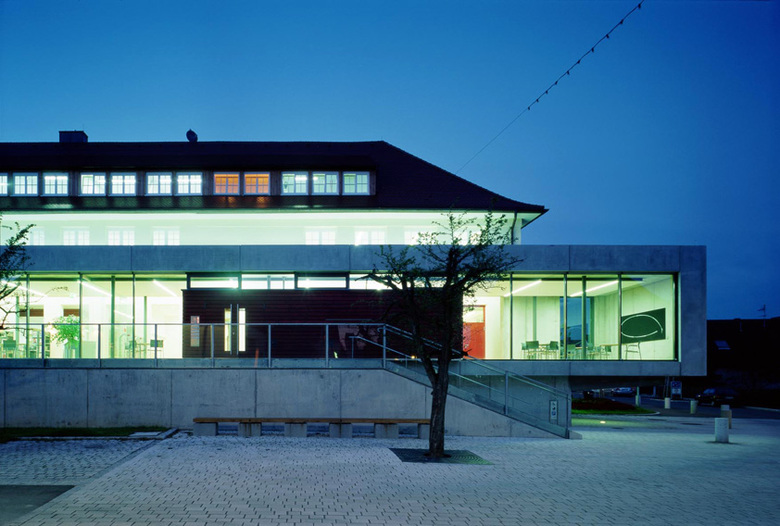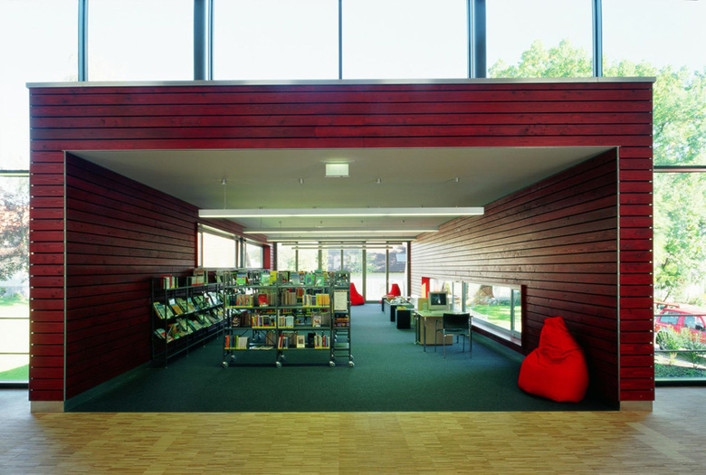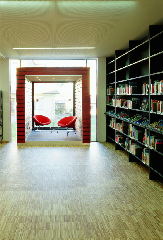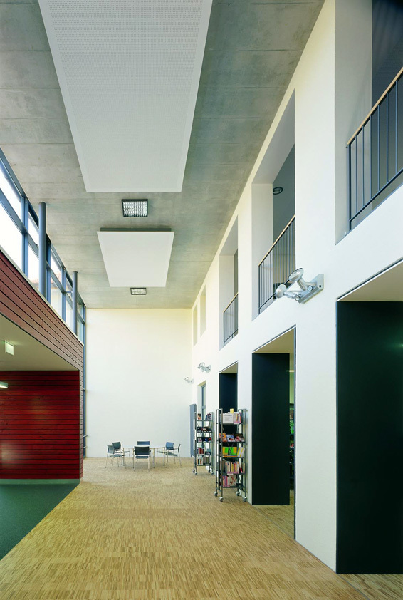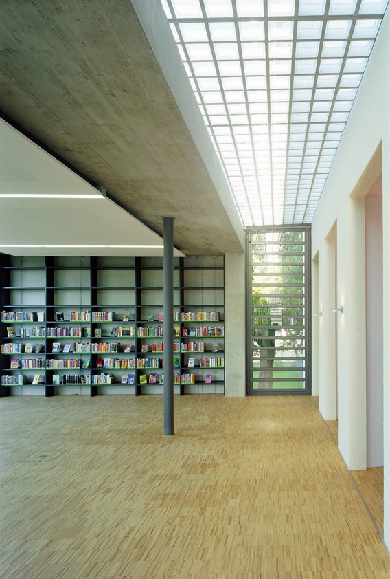 Im Erdgeschoß werden die publikumsintensiven Nutzungen, wie Bibliothek, Bistro und Saal angeboten. Diese Teilnutzungen sind durch vielfache Wege und Blickbeziehungen miteinander verflochten, doch können die einzelnen Bereiche separat abgeschlossen werden. So ist zum Bespiel die Bibliothek durch das Öffnen oder Verschließen einer Glaswand vom Foyer abtrennbar. Die Räume der Kunst- und Werkschule befinden sich im Souterrain, die Volkshochschule, verschiedene Mehrzweck- und Vereinsräume sind in den Obergeschossen und im Dachgeschoss zu finden. Die Problematik der Rettungswege wird an den nördlichen und westlichen Dachgauben durch Ausstiegsbalkone mit Anleitermöglichkeit gelöst.