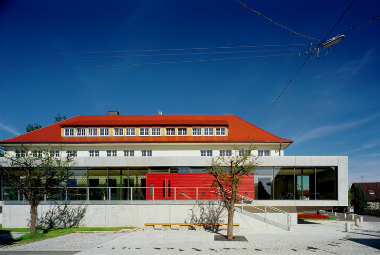 Der massive Baukörper der ehemaligen Grundschule dominiert die Sichtachse der Jägerstraße. Durch die Addition eines offenen – durch die Präzision seiner Form dominanten – eingeschossigen Baukörpers gewinnt der bestehende Baukörper die notwendige Maßstäblichkeit in der Höhenentwicklung zurück und setzt das notwendige Zeichen im Stadtraum. Das Bürgerhaus wird über eine gestaffelte Vorzone von ausladenden Treppen und Rampen von der Jägerstraße erschlossen. Die Anlieferung des Gebäudes erfolgt über einen Stichweg von der verkehrsberuhigten Friedrichstraße. Im Inneren wird das gesamte Erdgeschoß mit Bibliothek und Saal flächig in einer einladenden Geste erschlossen. Die vertikale Anbindung der Ober- und Untergeschosse erfolgt über den Einbau einer leichten lichtdurchlässigen Treppenanlage an Stelle des bestehenden Treppenhauses. Die neue Treppenanlage wird durch einen alle Geschosse und die Außenlieferung verbindenden Aufzug ergänzt.