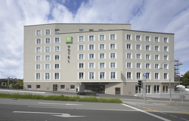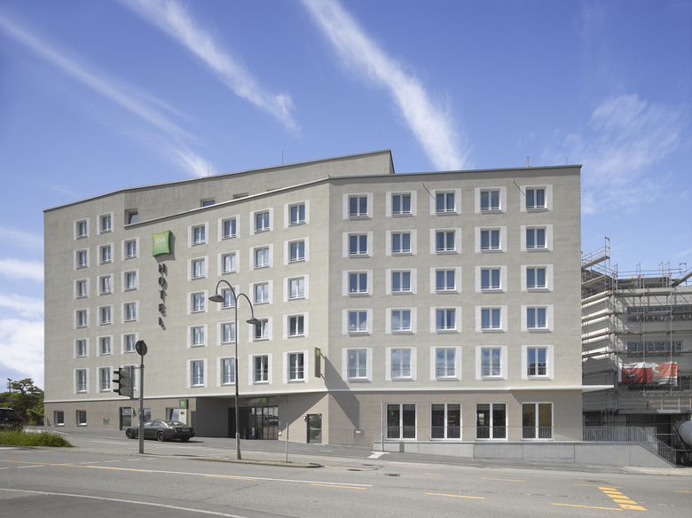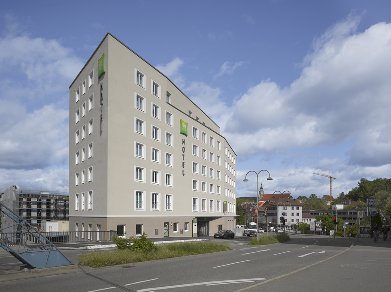 2014 starteten Aldinger Architekten mit den Planungen zum Hotelgebäude, wie es sich seit Mai 2016 an der Blauen Brücke präsentiert: Es ist das sechste Ibis Styles Hotel der Stuttgarter Success Group. Die als Barcode-Fassade mit hohem Glasanteil vorgesehene Gebäudehaut wurde zunächst zu einer regelmäßigen, hochwertigen Klinkerfassade umgearbeitet. Deren heller Backstein erinnert an die in Tübingen vorherrschenden Sandsteinfassaden und stellt am Tor zur Stadt den Bezug zur traditionellen Bebauung her. Leider sprachen gegen diesen Vorschlag finanzielle Gründe, weshalb die Architekten in einem weiteren Optimierungsprozess eine differenziert bearbeitete Putzfassade entwarfen, mit der die Balance zwischen Kosten- und Gestaltungsfragen gelang.