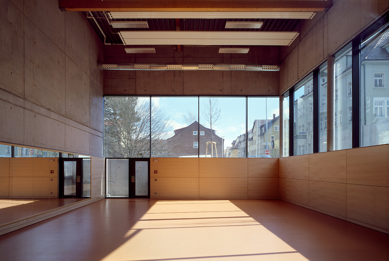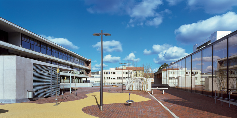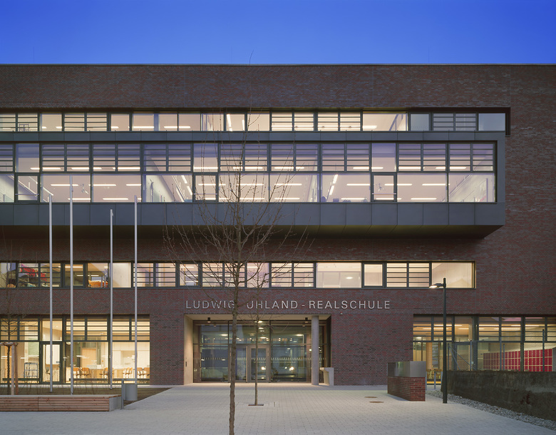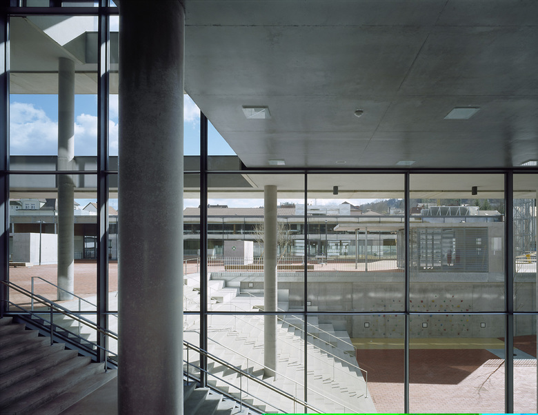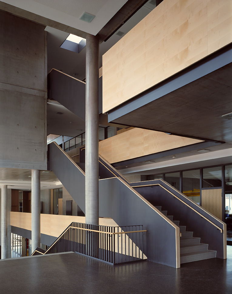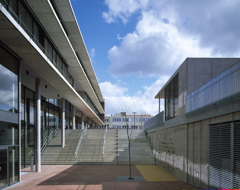Über eine großzügige Freitreppe kommt man in das auf Pausenhofebene gelegene Foyer mit der Cafeteria sowie in den intern verbundenen Ganztagesbereich. In den Obergeschossen befinden sich die größtenteils nach Süden orientierten Klassenräume. Die Verwaltung im 1.Obergeschoss und die Medienbereiche mit Computerräumen im 2.Obergeschoss sind nach Norden orientiert.