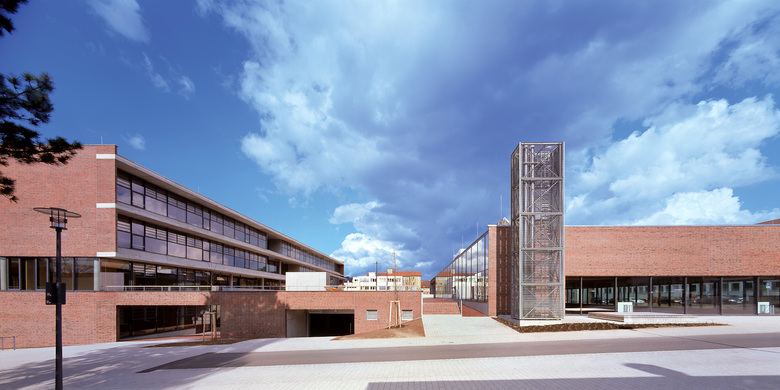 Der Hauptzugang der Schule orientiert sich mit der Platzfläche zur Bahnhofstraße hin, dort befindet sich auch die Anbindung an den öffentlichem Nahverkehr sowie die Fahrradstellplätze. Die Sporthalle ist sowohl von der Straßenebene als auch vom Pausenhof erschlossen. Die Pkw-Stellplätze befinden sich auf einem Parkdeck unter dem Pausenhof. Von hier aus sind die Schule und die Sporthalle auf der Eingangsebene erschlossen. Über einen Aufzug sind alle Ebenen der Schule und Sporthalle barrierefrei zu erreichen.