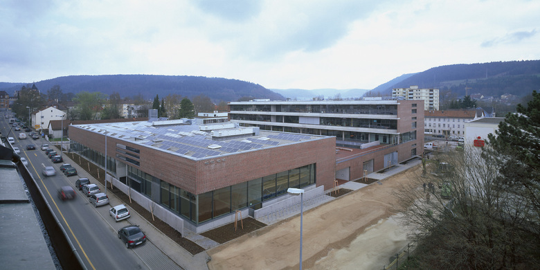 Das Gebäude wurde aus wirtschaftlichen und bauphysikalischen Gründen als konventionelle Konstruktion im Stahlbeton-Massivbau errichtet. Die äußere Verkleidung erfolgt über eine Wärmedämmung mit hinterlüfteter Klinkerverkleidung. Alle Verglasungen werden durch dauerhafte Holz-Aluminium-Elemente gebildet. Die Flachdächer sind mit Photovoltaik-Anlagen belegt. Geheizt wird mit einer Hackschnitzel-Heizung in Verbindung mit Gas-Fernwärme. Der Innenausbau wird im Wesentlichen durch unbehandelte Konstruktionsoberflächen und Holz-Einbauten bestimmt.