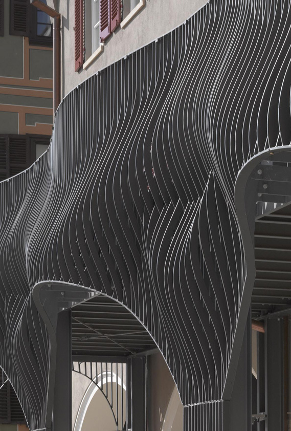 Auf der Marktplatzseite wurde eine Stadtloggia aus geschwungenen Stahlstäben ergänzt. Die Geländerkonstruktion nimmt die Form der Arkadenbögen auf und erzeugt unterschiedliche Aufenthaltsqualitäten im öffentlichen Raum, die bei zahlreichen öffentlichen Veranstaltungen auf dem Bietigheimer Marktplatz bespielt werden. Der zurückgesetzte Stahlbau des neuen Quergiebels erhält eine homogene Kupferverkleidung, die den neuen Baukörper sichtbar gegen den Bestand absetzt und gleichzeitig den neuen Zugang markiert. Die Kupferverkleidung wird in der Halle in Form einer aufgelösten Streckmetalldecke fortgesetzt. Im Süden wird die Kupferstruktur in Form einer großen Toranlage am neuen Haupteingang an der Hauptstraße abgeschlossen.