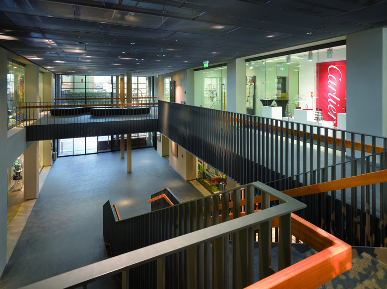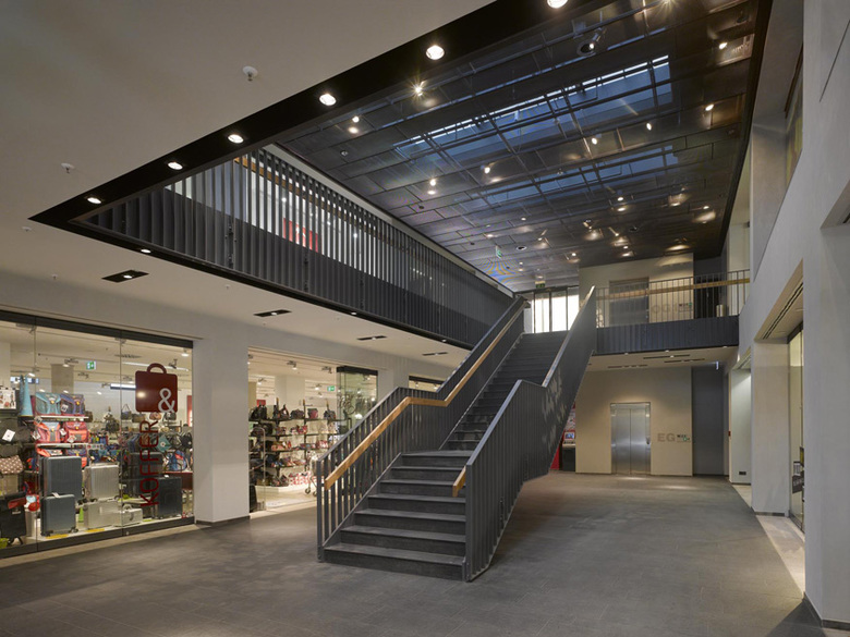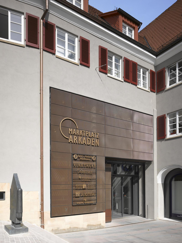 Der bisher offene Innenhof wurde überdacht und in eine zweigeschossige, großzügige Erschließungshalle umgewandelt, die als öffentliche Passage die untere Marktplatzebene mit dem höher liegenden Kirchplatz verbindet. Die neu erstellten Verkaufsflächen bieten durch flexible Glastrennwände die Möglichkeit sich zur Halle hin großzügig zu öffnen. Durch neu in die Arkadenbögen eingesetzte Verglasungen entsteht im Erdgeschoss zusätzlicher Innenraum und einladende, großzügige Schaufensterflächen.
