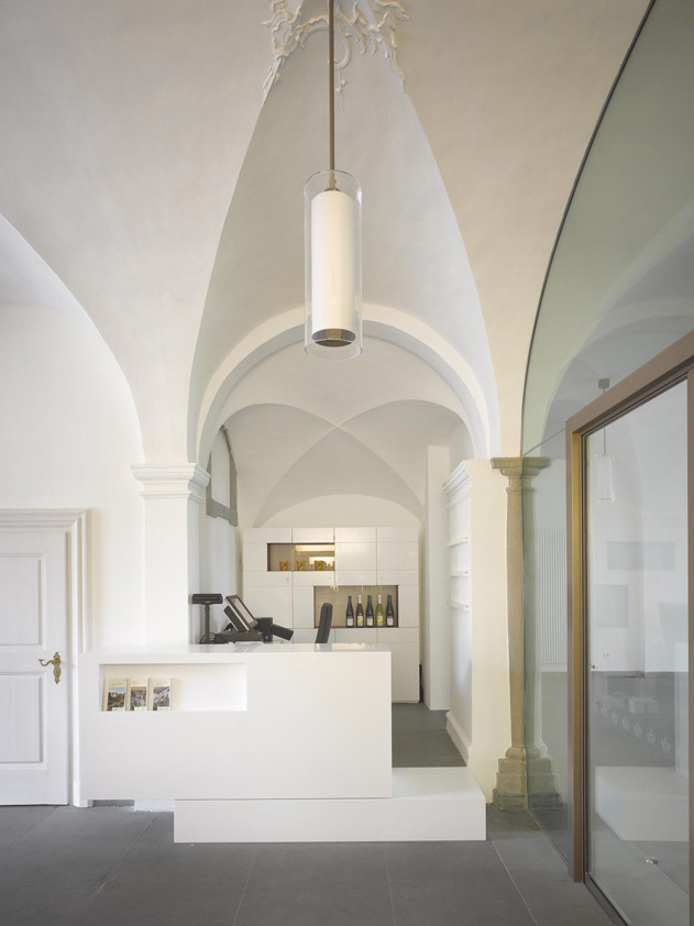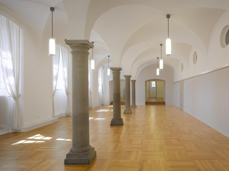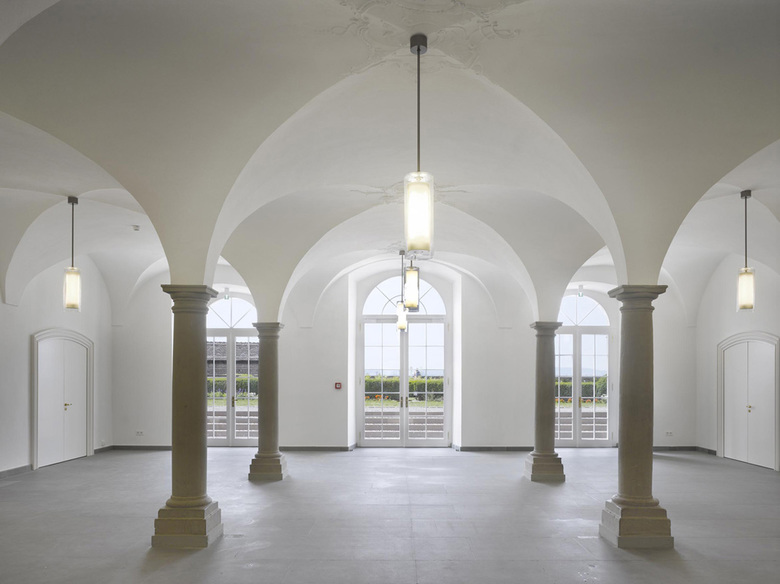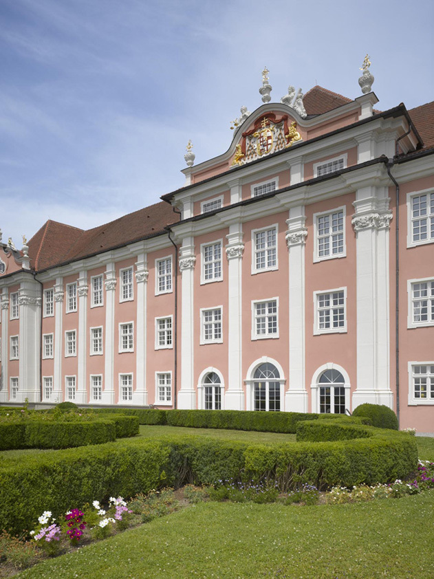 Das Neue Schloss Meersburg liegt am größten Platz der Stadt, die durch ihre mittelalterliche Struktur geprägt ist. Von der Seeseite aus betrachtet, fügt sich das historisch bedeutende Bauwerk in das Ensemble aus Staatsweingut, Internat und der Meersburg ein. Der Meersburger Schloßplatz wird für verschiedene Großveranstaltungen genutzt. Die dem Platz abgewandte Seeterrasse des Schlosses bietet einen grandiosen Blick auf den Bodensee und das Alpenpanorama. Durch die Öffnung des Vestibüls zum See hin und eine beidseitige, barrierefreie Erschließung werden Platz- und Seeseite miteinander verbunden, so dass Veranstaltungen nun zu beiden Seiten des Schlosses organisiert werden können. Die Räumlichkeiten im Innern des Neuen Schlosses werden ihrer Nutzung entsprechend klar zoniert: Alle repräsentativen Räume wie Ausstellungs- und Tagungsräume orientieren sich zur Seeseite hin, während die dienenden Funktionen wie Erschließung, Küchen, Lager und Sanitärräume in Richtung Schlossplatz angeordnet sind. Der Vorteil dadurch: Das große Potential des Neuen Schlosses für Ausstellungen und Veranstaltungen, die von kleineren Tagungen bis zum großen Staatsempfang reichen, kann wesentlich besser genutzt werden. In der ersten Etage können Konferenzen mit Bewirtung stattfinden, ohne dass der Museumsbetrieb beeinträchtigt wird. Im musealen Bereich ist eine didaktische Ausstellung vorgesehen. Hier wird eine Doppelnutzung bewusst vermieden. Die Räume sind ihrer Nutzung entsprechend mit perfekter Beleuchtung und Medientechnik ausgestattet und tragen so den besonderen Anforderungen an Belichtung und Bauphysik Rechnung. Das Erdgeschoss beherbergt das Café. Um die Verbindung zwischen Platz und Seeterrasse zu betonen, wird das Vestibül frei gehalten. In den Abendstunden – nach Schließung des Museums – sind hier festliche, private Veranstaltungen möglich. Auch könnte in einem weiteren Planungsschritt das Teehaus für Sommerveranstaltungen gerüstet werden.