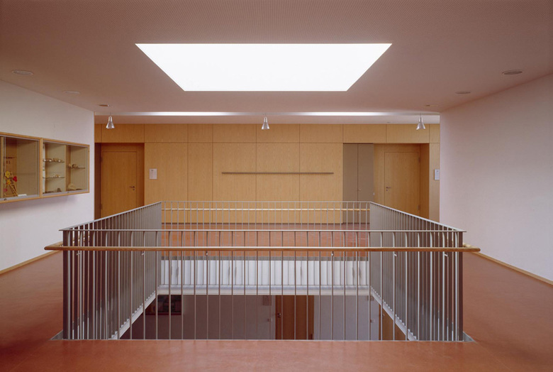 Der Baukörper bildet zur umgebenden Bebauung auf zwei Seiten eine klar definierte, schützende Raumkante und schließt an dieser Stelle das Ensemble öffentlicher Bauten ab. Zur angrenzenden Wohnbebauung entsteht eine klare Zäsur. Proportion und Höhe der vorhandenen Bauten werden im Grundsatz übernommen, jedoch im Detail präziser gefasst.