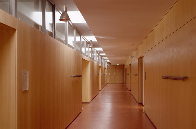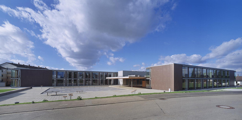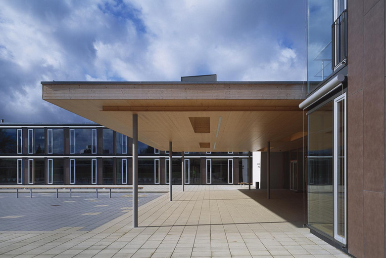 Die Transparenz zwischen Innen- und Außenraum ist Programm. Transparenz fördert Kommunikation, die Basis der schulischen Arbeit. Tageslicht, natürliche Werkstoffe, ruhige Farbigkeit und räumliche Klarheit machen das Gebäude zum unverwechselbaren Ort. Ein Ort, der Lehrern und Schülern die Möglichkeit zur Identifikation bietet, ein Ort der Identität schaffen kann. Die Glasfassade ist als Pfosten-Riegel-Konstruktion in Holz-Aluminium ausgeführt. Lüftungsflügel sind als Holz-Aluminium-Elemente in die Konstruktion eingesetzt. Geschlossene Faserzement-Paneele nehmen im Innenraum vertikal angeordnete Heizkörper auf. Der Sonnenschutz erfolgt über außenliegende Senkrechtmarkisen. Geschlossene Bereiche, zum Beispiel vor Wandschotten oder im Bereich der Treppenhäuser, sind mit mineralischer Dämmung und vorgehängten, hinterlüfteten Faserzementpaneelen verkleidet.