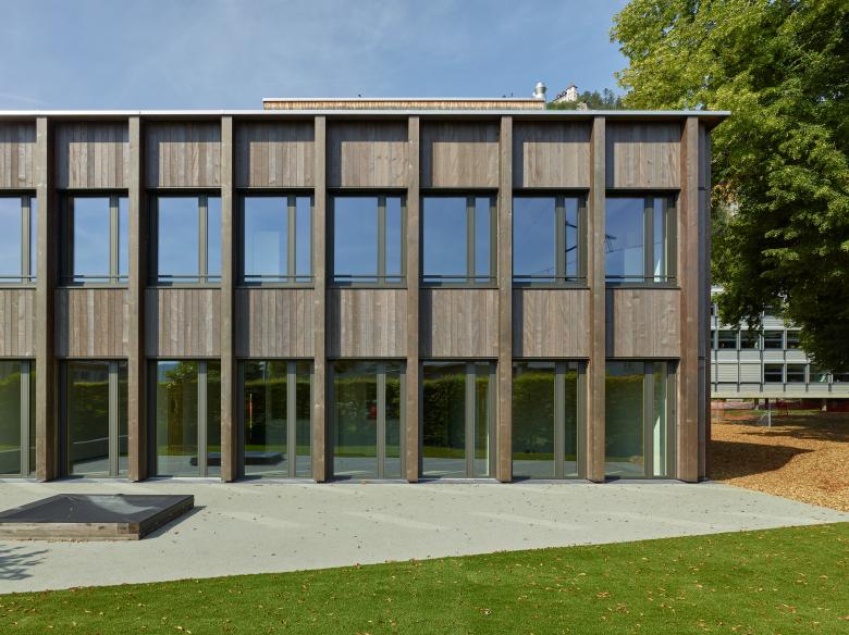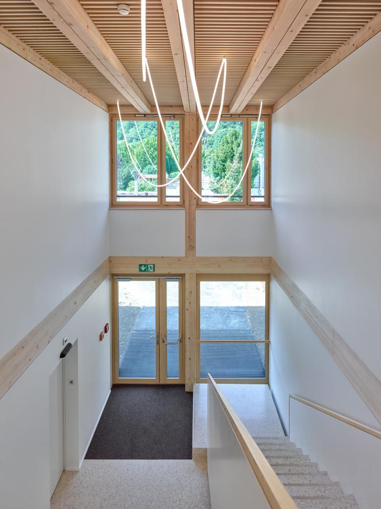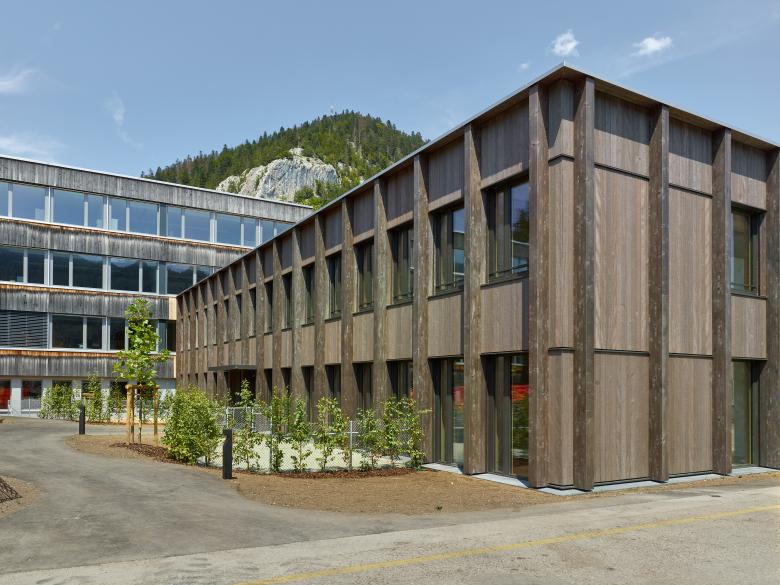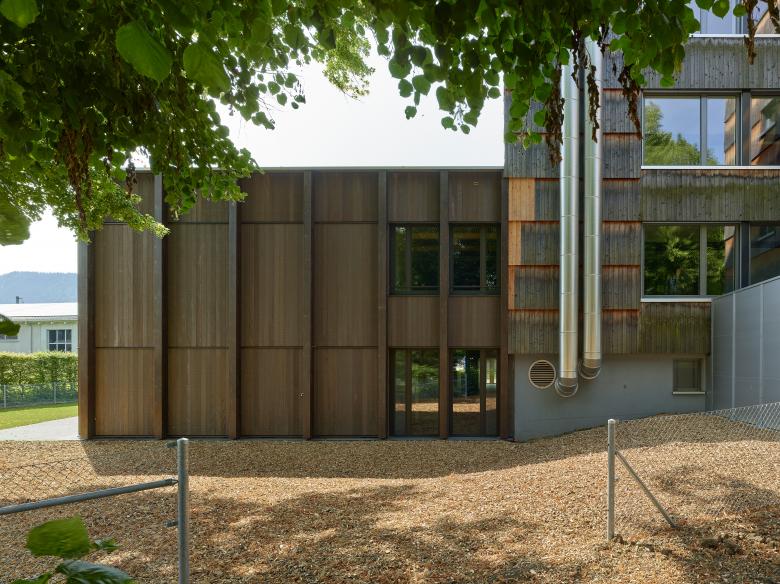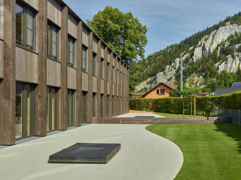 La structure porteuse et le revêtement des façades sont réalisés avec le bois issu des forêts communales.
