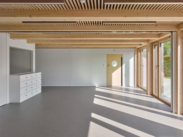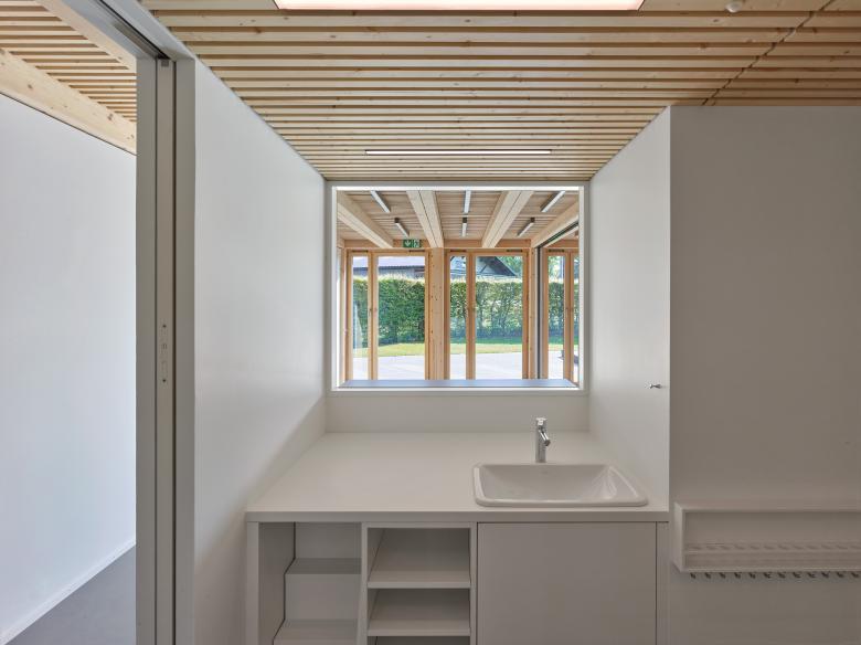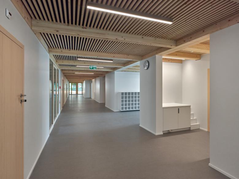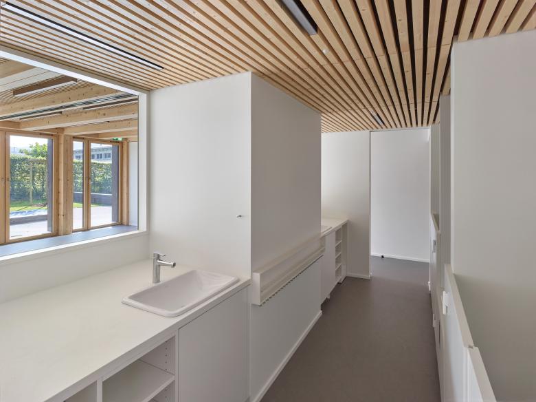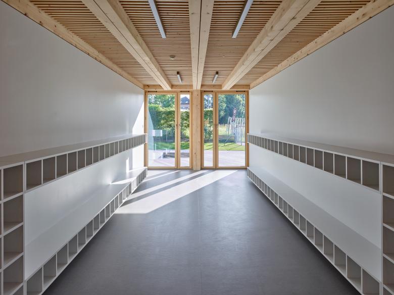 La première étape de réalisation du concours se concentre sur la partie d’accueil de l’enfance. La structure d’accueil préscolaire se place sur un niveau à l’extrémité Sud-Est, éloignée du trafic. La structure d’accueil parascolaire est, elle, prévue comme étage supplémentaire sur le même volume. Cette extension bénéficie d’une placette arborisée dans la continuité de la place de Longereuse, ainsi qu’un espace extérieur plus paisible pour la structure préscolaire à l’Est, au fil de l’Areuse.