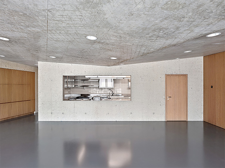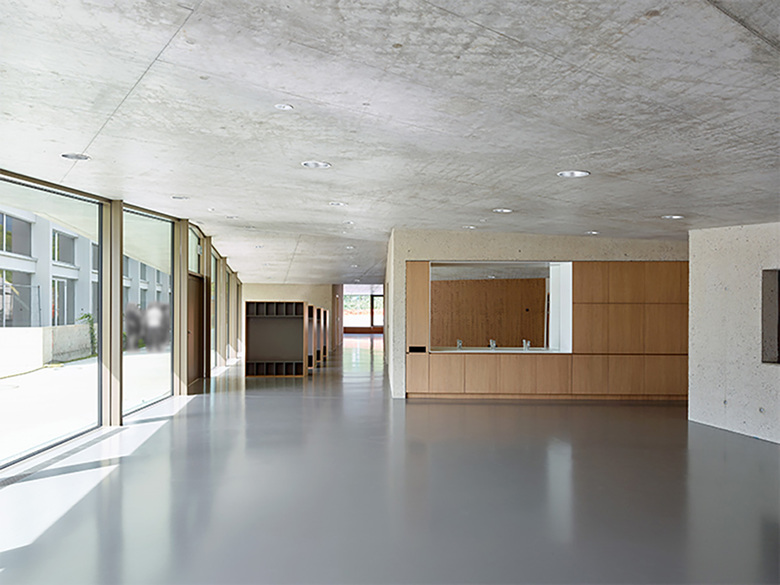 L’organisation des espaces est naturelle et logique. L’entrée est placée à la charnière entre le jardin public et la cour d’école, le vestiaire et le réfectoire sont directement accessibles depuis l’entrée, et les salles d’activités se trouvent de façon fluide dans le prolongement de ces espaces.