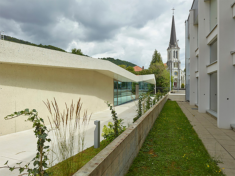 Le projet prend place entre un bâtiment d’habitation pour personnes âgées et le collège de Cressier.