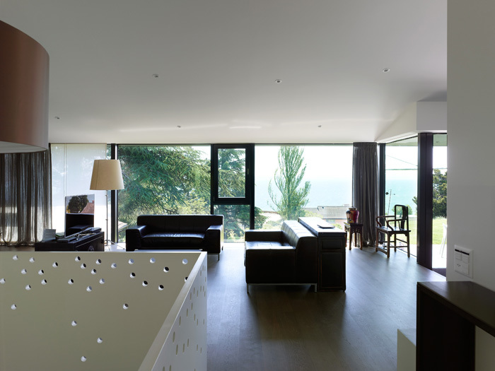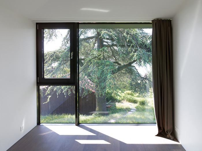 Les pièces de vie s’ouvrent sur un véritable tableau composé, au premier plan, d’un cèdre majestueux et se prolongeant sur l’horizon, le lac et les Alpes.