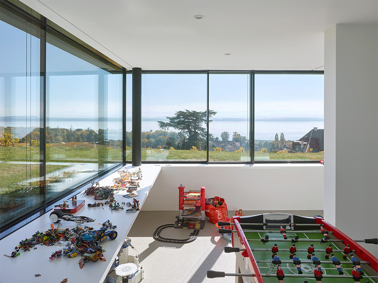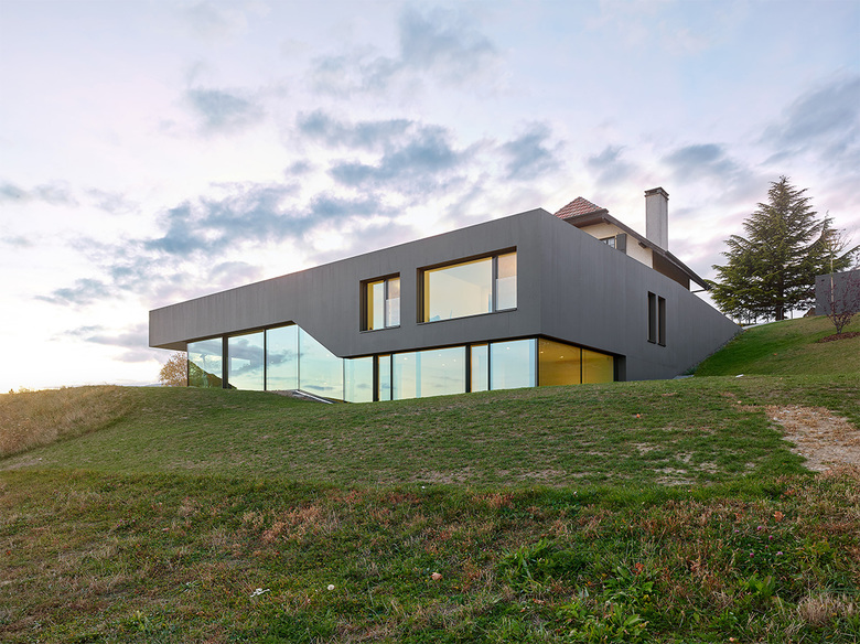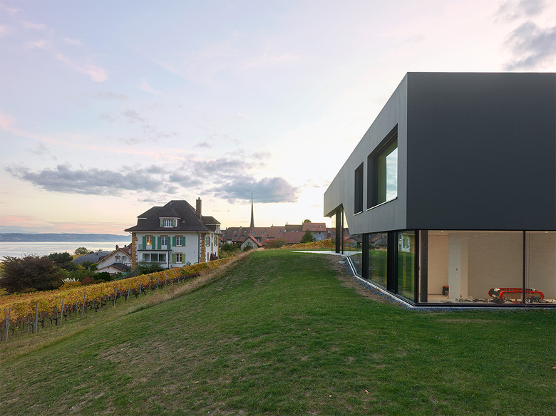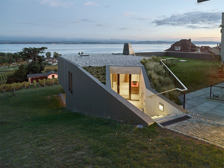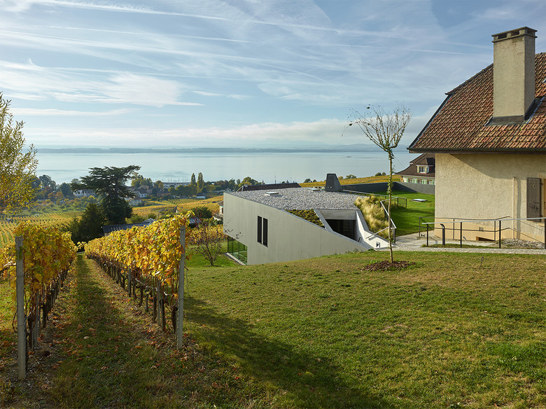 À mi-chemin entre le village et le vignoble de Cortaillod, cette nouvelle habitation semble sortie de terre sous le jardin d’une bâtisse des années 40.