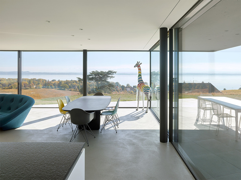 Une promenade dans le jardin permet d’apprécier le volume minéral de la construction semblant flotter sur un large bandeau vitré suivant la topographie du terrain.