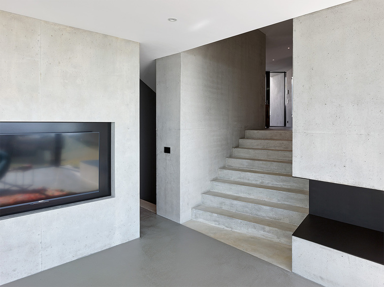 Conçue de manière à se fondre dans le paysage, la construction, presque imperceptible depuis la rue, signale sa présence par un escalier creusé dans sa toiture stimulant la curiosité du visiteur.
