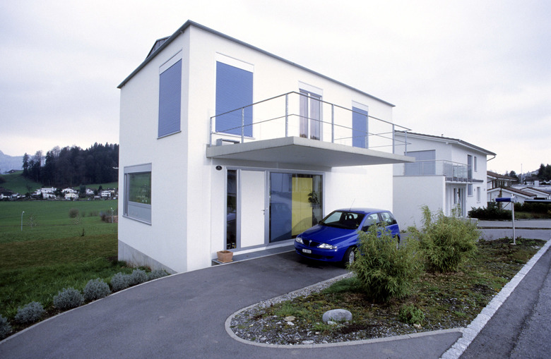 Die Zufahrt ist als Referenz an die Villa als Wendeschlaufe ausgebildet. Ein grosses auskragendes Dach zeigt den Autoabstellplatz und den Eingang an. Die gesetzlich erlaubte Auskragung und der Platzbedarf des Fahrzeuges bestimmen die Nordkante des Gebäudes. Seitlich sind Baulinien vorgegeben. Die Ausbildung als Einbünder mit geringer Bautiefe ermöglicht auf der Südseite eine kleine Gartenfläche.