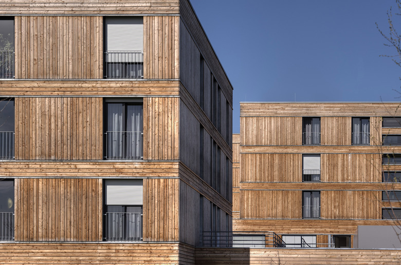 Hinsichtlich der Materialität und der Details haben wir nach einfachen und nachhaltigen Lösungen gesucht. Eine naturbelassene Schalung aus heimischem Lärchenholz, welche im Lauf der Zeit eine silbergraue Färbung einnehmen wird, trägt dazu bei, das große Gebäude als Teil der Landschaft zu begreifen.