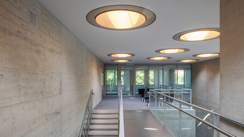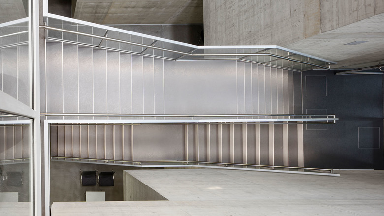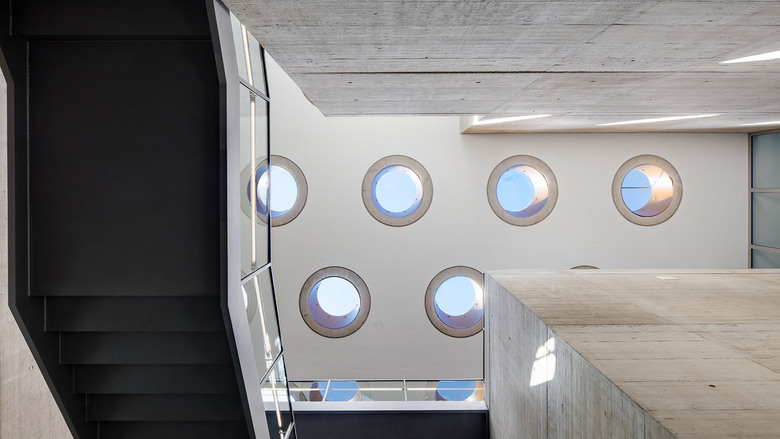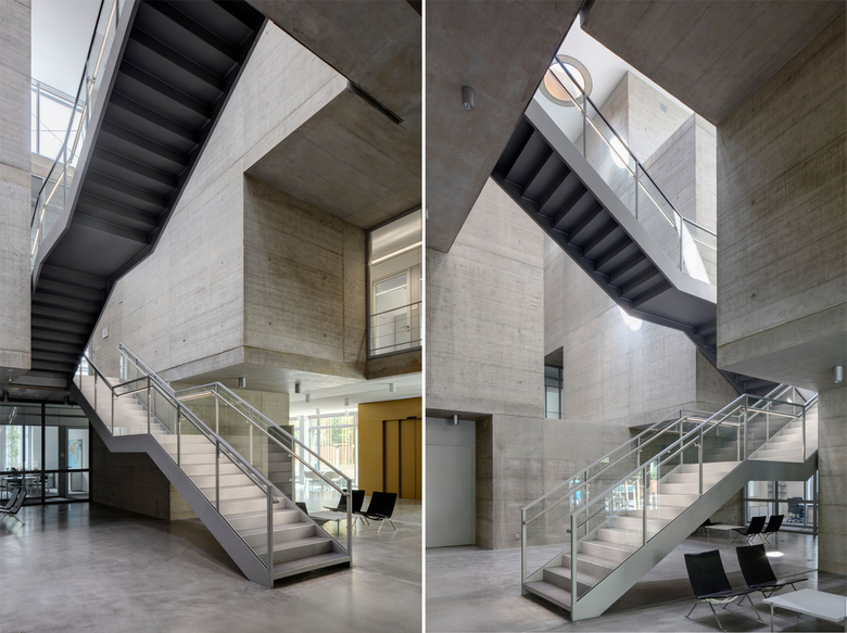 Der Kern des Gebäudes – das Atrium – besteht aus übereinandergeschichteten, zueinander verdrehten oder geschossweise versetzten Kuben, die durch den konsequenten Einsatz von Sichtbeton an eine gewachsene Steinformation erinnern. Zwischen den geschichteten, steinernen Kuben fügt sich eine leichte Stahltreppe mit einem nahezu immateriellen Glasgeländer ein, die sich durch Richtungswechsel in den jeweiligen Ebenen an den Kuben nach oben windet. Von den umgebenden Bürozonen aus öffnen sich großzügige (Brandschutz) Verglasungen mit jeweils völlig unterschiedlichen Einblicken ins Atrium.