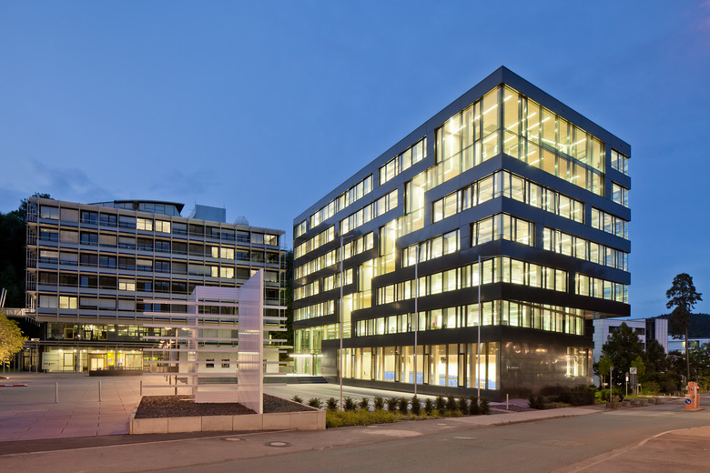 Aus einer behutsam aufeinander abgestimmten Mischung industriell vorgefertigter Materialien und vor Ort gegossener Betonflächen entwickelt sich eine spannungsreiche, werkstattcharakterähnliche Atmosphäre. Als Kontrast zur dunklen Aluminiumfassade dominiert die Farbe Weiß die Gebäudeinnenausstattung und -einrichtung in Verbindung mit den Sichtbetonoberflächen.