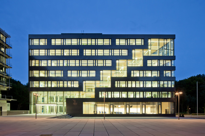 Die durch das Gebäude mäandernde Treppe funktioniert wie eine Hauptschlagader und tangiert auf jedem Geschoss zentrale Kommunikationszonen, die sich über alle sieben Geschosse spektakulär zueinander öffnen. Um das zweigeschossige Foyer liegen der abgestufte Hörsaal und die Seminarräume. Glas ist das bestimmende Element im Innenraum, denn sowohl die in alle vier Himmelsrichtungen orientierten Büros als auch die in der mittleren Zone liegenden Besprechungs-, Kopier- und Bibliotheksräume fördern die zufällige oder auch gewollte Kommunikation durch ihre Transparenz. Abgewogene verglaste Fassaden lassen zudem gleichmäßiges Tageslicht tief in das Gebäudeinnere eindringen.