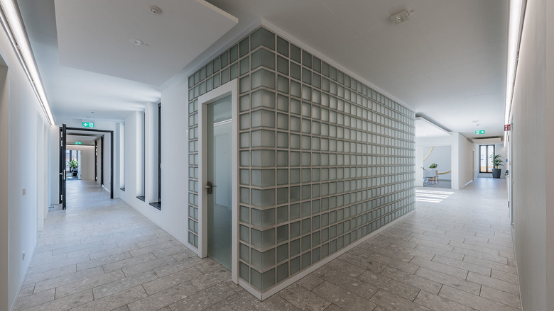Der Vorplatz ist angenehm proportioniert und mit wenigen Mitteln wie etwa dem Brunnen angemessen gestaltet … Die innere Erschließung ist übersichtlich. Der im ersten Obergeschoss liegende Innenhof schafft eine besondere räumliche Situation, die vor allem der Belichtung der Erschließungsflächen zugutekommt.