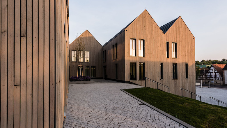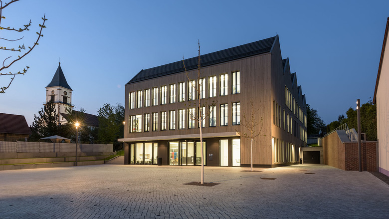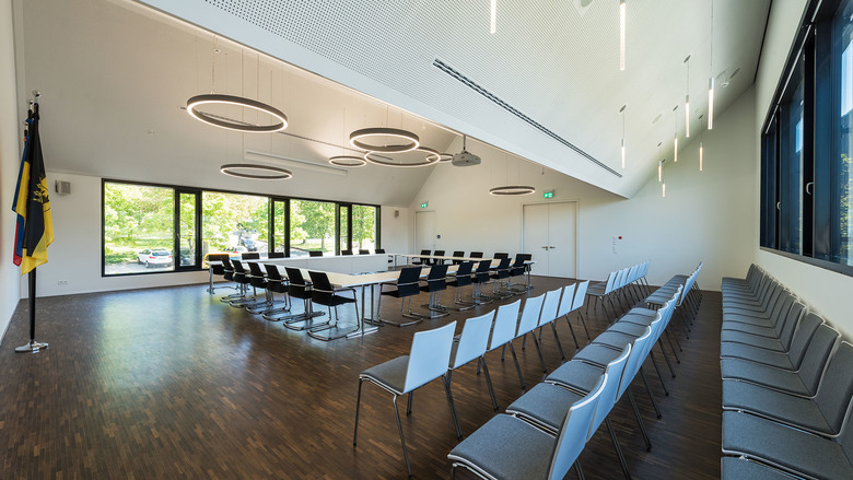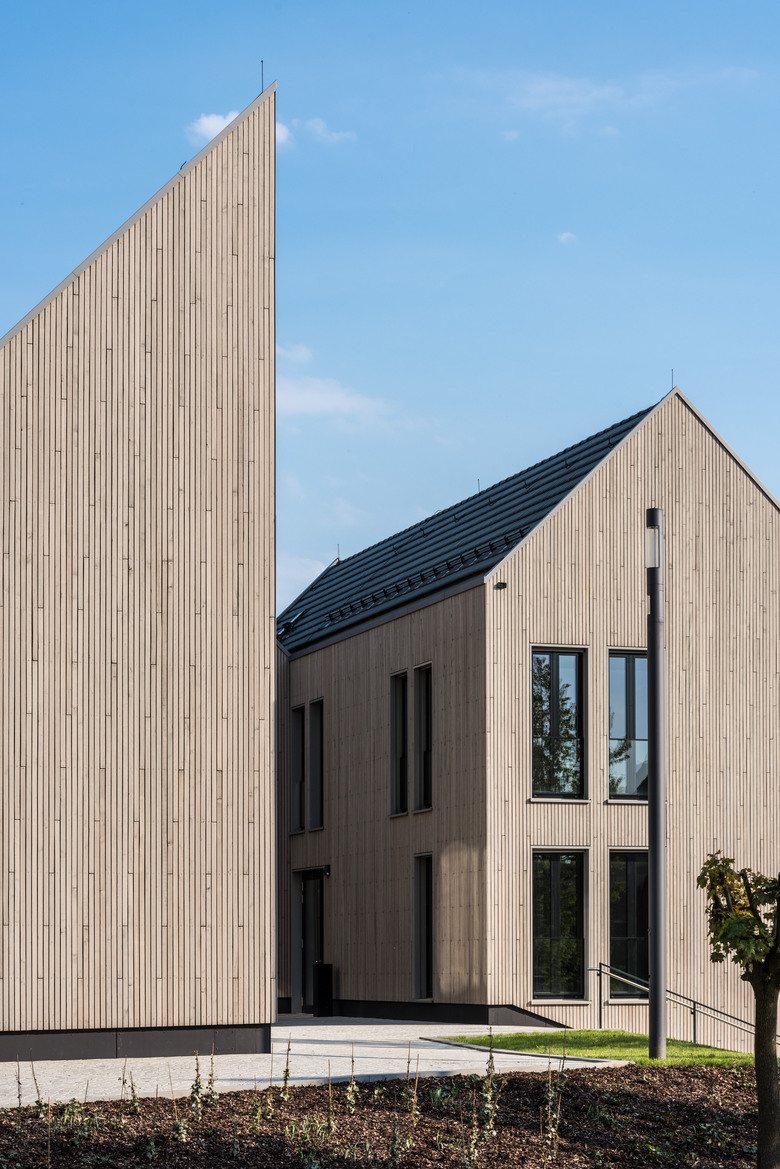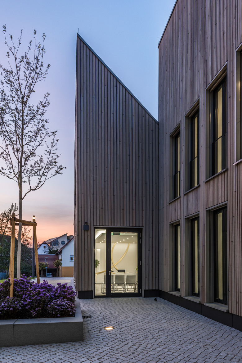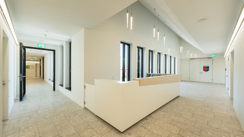 Der Ausgangspunkt dafür ist die Differenzierung des Baukörpers in einer von Satteldächern bedeckten Gesamtstruktur, die sich gut in den Kontext einfügt.