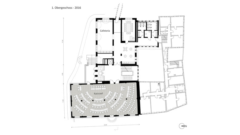 Im Zuge der Sanierung und Restaurierung wurden unter Berücksichtigung hoher Denkmalschutzanforderungen die Technik und der Brandschutz komplett erneuert. Statt kleinteiliger Nebenraumnutzungen öffnet sich das Erdgeschoss nun transparent und bürgernah zum Marktplatz, der Ratssaalvorbereich im 1. Obergeschoss präsentiert sich als großzügige Cafeteria.