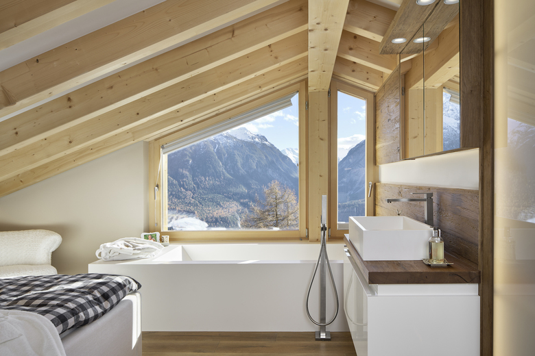 die aussicht gigantisch, die lage traumhaft, das haus klein aber fein. eine ideale kombination von hütte und bijoux - der blick aus der badewanne im masterbedroom fantastisch. innen glatputz, markiges, schön verarbeitetes altholz. superfunktionale und bis ins kleinste detail geplante bäder und duschen lassen keine wünsche offen. von der bauherrin liebevoll und stilsicher eingerichtet ist dieses feriendomizil ein ort zum verweilen und geniessen.