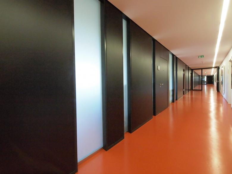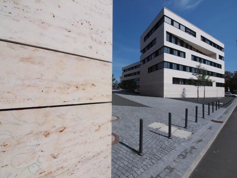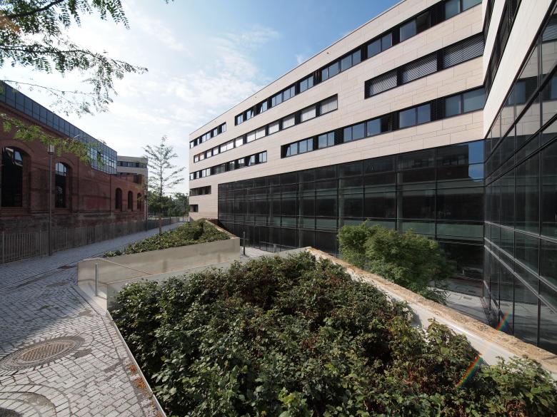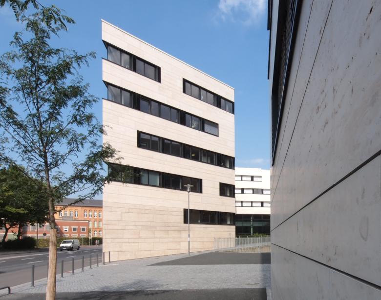 Aus dieser Aufgabenstellung formulierte sich das Konzept für die beiden Institutsbauten als steinerne Skulpturen mit klaren stadtraumprägenden Kanten, welche mit der Bestandssituation und den entstehenden Zwischenräumen auf besondere Art und Weise korrespondieren. Darüber hinaus formen die skulpturalen Gebäude eine neu definierte Eingangssituation der Universität, welche über einen begrünten Vorplatz hin zum neuen Haupteingang in das Innere des Hauptbaukörpers leiten. Hier setzen sich die publikumsintensiven Foyer- und Haupterschließungsbereiche durch ihre Glasfassaden klar von der steinernen Jurafassade, mit ihren präzise eingelassenen Fensterbändern ab und öffnen die Neubauten im Gebäudeinneren hin zum Campus und dem historischen Bestand der ehemaligen Hentschel - Anlage. Aus verschiedenen Blickbezügen innerhalb der Neubauten kommt es dadurch zu Ein- und Ausblicken sowie differenzierten Licht- und Raumsequenzen entlang der 3-geschossigen Foyerzonen. Durch das einfallende Tageslicht geführt, ergeben sich dadurch vielschichtige Raumsequenzen innerhalb des Erschließungssystems, die zum Verweilen und zum wissenschaftlichen Gespräch einladen.