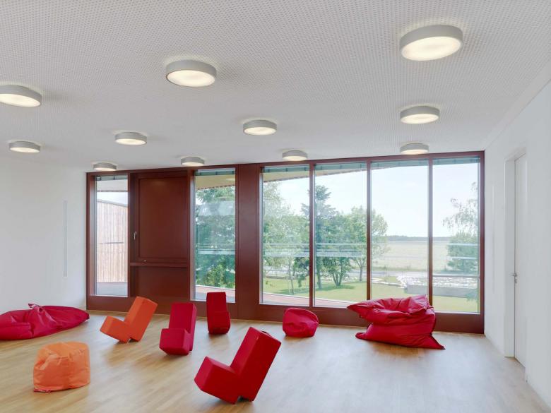 Im Innenraum des Haupthauses findet sich unter einem Oberlicht ein gefasster introvertierter Raum, in dessen Zentrum die „Treppe der Begegnung“ ruht. Neben ihrer Erschließungsfunktion für die Schlafsäle im 1. Obergeschoss dient diese als kommunikatives Zentrum. Neben der Möglichkeit des Verweilens und des Gespräches finden hier auch Ausstellungen und verschiedene Veranstaltungen statt.