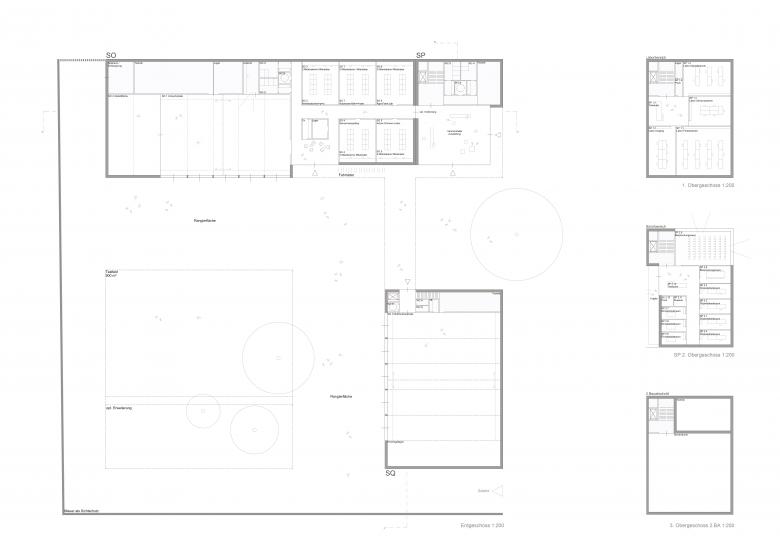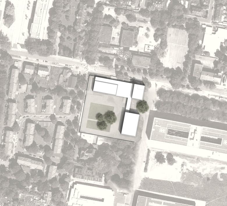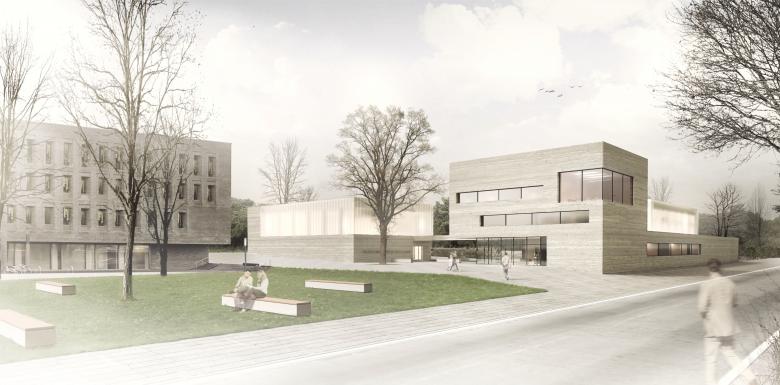 Durch die Lage der neuen Gebäude wird ein feinsinniges Ensemble entwickelt, welches dem neuen Campusvorplatz an der Sedanstraße eine entsprechende Fassung, bzw. einen Abschluss verleiht. Durch die leichte Erhöhung des Laborgebäude-SP entsteht eine repräsentative Eingangssituation in den Campus. Diese neue Adressformulierung wird, durch das verglaste multifunktionale Foyer im Erdgeschoss und der raumhohen Verglasung des großen Besprechungsbereiches im 2.OG mit Blick auf dem Hochschulvorplatz, weiter inszeniert. Hin zur Sedanstraße folgt die Gebäudestruktur dem Straßenzug. Entlang der Artilleriestraße wird eine Fassung durch die Weiterentwicklung der bereits vorhandenen Mauer vorgesehen. Hierdurch entsteht eine introvertierte begrünte Hofsituation, in dessen Zentrum das Testfeld mit den entsprechenden Rangierflächen eingebettet ist.