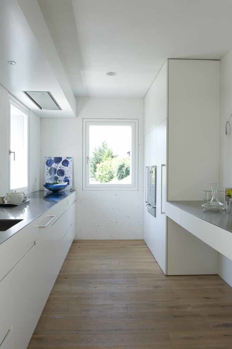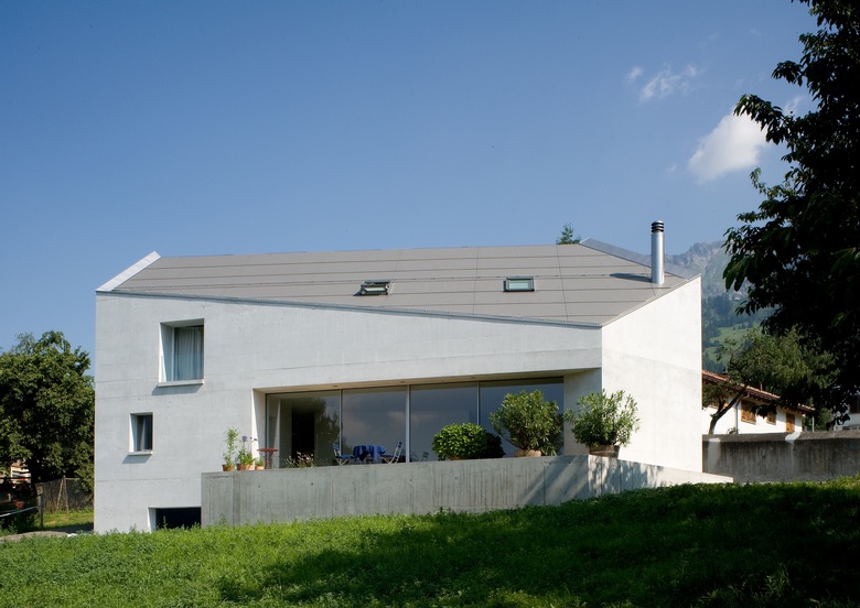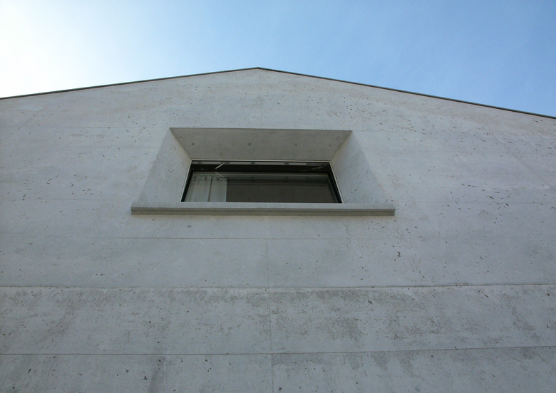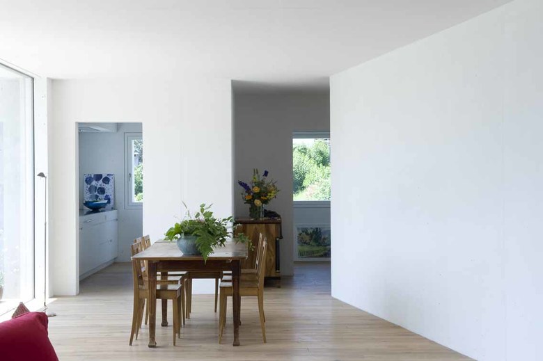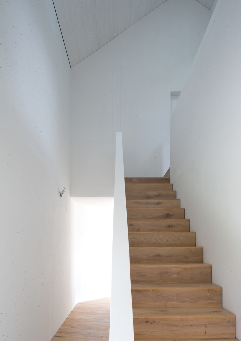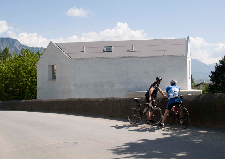 Gebaut ist das weisse Haus komplett monolithisch aus Misaporbeton mit weissem Zement, aussen und innen sichtbar belassen. Die Wände sind durchwegs 50 cm stark. Die Bodendielen sind aus massivem Eichenholz, eine Reminiszenz an den Weinbau. Beheizt wird das Haus einerseits passiv durch die Sonne, andererseits mit dem Kamin und mit einer Erdsonden-Wärmepumpe für die Grundlast.