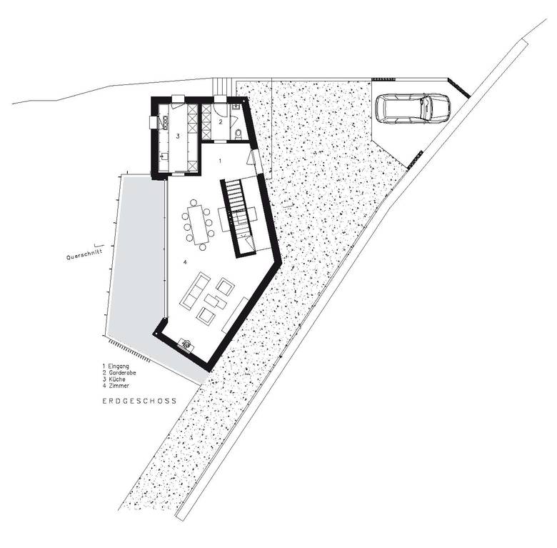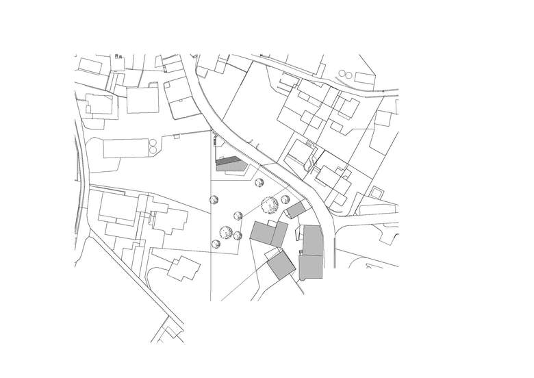 Jenins ist eine der vier traditionellen Weinbaugemeinden in der Bündner Herrschaft. Das weisse Haus im Obstgarten gehört zum Ensemble des Weingutes zur Sonne, am Ausgang des alten Dorfkernes in Richtung Malans. Es ist das ‚Stöckli‘ auf dem Weingut und ist hinter der Umfassungsmauer entlang der Hauptstrasse am obersten Eck im Westen des Obstgartens situiert. Die fünfeckige Grundrissform entwickelt sich aus den Bezügen zur Umgebung. Die beiden symmetrischen, klassischen Giebelfassaden stehen im Nordosten parallel zur Hauptstrasse und im Westen parallel zur Grenze des Obstgartens. Die nördliche Trauffassade flankiert den Zugangshof. Die Raumsequenzen und die Fensteröffnungen reflektieren die Grösse und die Zuordnung der Räume im fünfeckigen Grundriss. Das Wohnzimmer mit dem grossen Fenster zur vorgelagerten Veranda gegen Süden hin, die Küche im Südwesten mit den beiden Fenstern über Eck gegen Süden und Westen. Im Obergeschoss befindet sich das Gästezimmer mit dem giebelständigen Fenster gegen Osten und das Schlafzimmer mit einem raumhohen Schiebefenster südseitig sowie dem Giebelfenster gegen Ost.