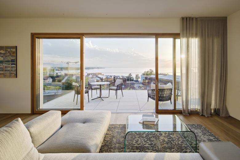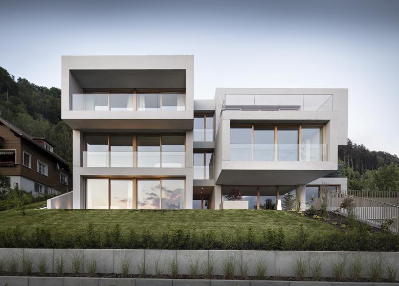Das Baugrundstück der Bauherrin ist einer dieser Orte. Der See im Südosten und am Hang gelegen sind fürs Wohnen in dieser Stadt von kaum überbietbarer Qualität. Der Umgang damit prägt die Architektur, leitete den Entwurf. Der weite Blick über den Bodensee, Sonnenauf- und -untergänge verlangen ein entsprechendes Verhältnis zwischen Innen und Außen und eine darauf abgestimmte Organisation des Hauses. Die skulpturale Ausformung des Volumens ermöglicht den Zugriff aller Wohn- und Arbeitsräume auf die Sicht zum See. Die Schicht der Nebenräume bilden den Rücken zum Hang, die Inszenierung der Erschließung verknüpft die Funktionen mit den beschriebenen Lagequalitäten. Weg und Aussichten erzeugen die Spannung die der Situation entsprechen. Um dem Narrativ des Hauses gerecht zu werden, war der minimalistische, sehr präzise Umgang mit allen Details wichtig. Der gebaute Raum ist an jeder Stelle sichtbar. Das Leben um und im Haus ist das Leben am Bodensee.
