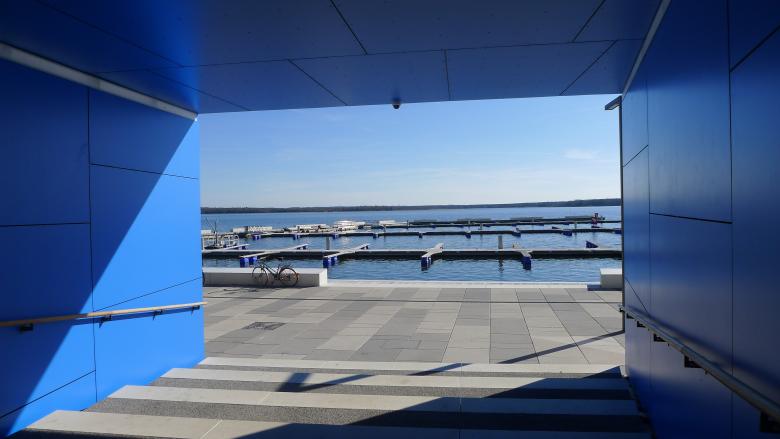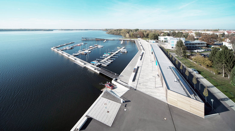 Durch die Realisierung schwimmender Molen und Anleger konnte die Uferzone trotz fehlender Gründungsebene baulich besetzt werden. Die entwickelten Sonderkonstruktionen für die Verankerung der schwimmenden Bauteile im Seegrund sind innovatives Vorbild für zukünftige Erschließungen vergleichbarer Lagen im Seenland. Landseitig ist die mit großformatigen, in drei Farbnuancen changierenden Platten ausgestattete Promenade hafentypisch flexibel nutzbar. Sie nimmt die vorhandenen Wege der angrenzenden Uferparklandschaft auf und bindet über Rampen und großzügige Freitreppen die angrenzenden Nutzungsebenen an. Sie bietet als urbaner Ort, Raum für Kommunikation, Events und entspanntes Hafenleben.