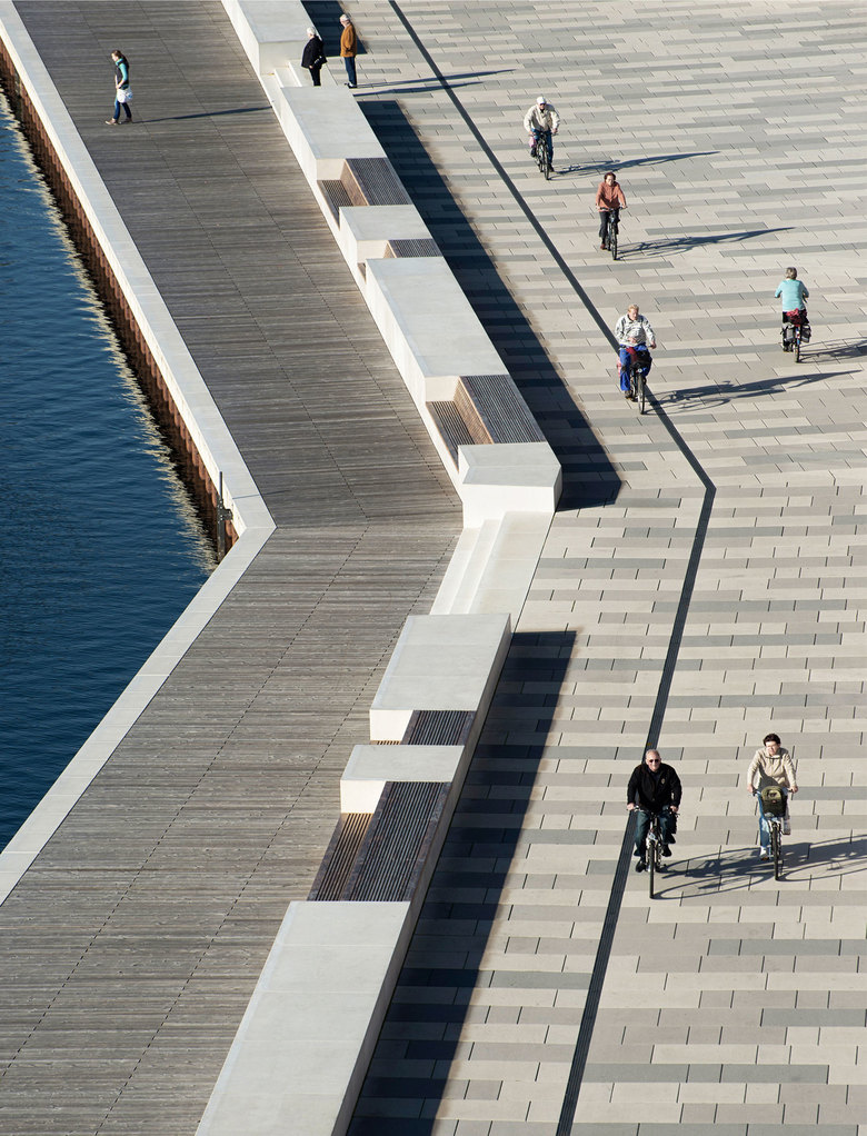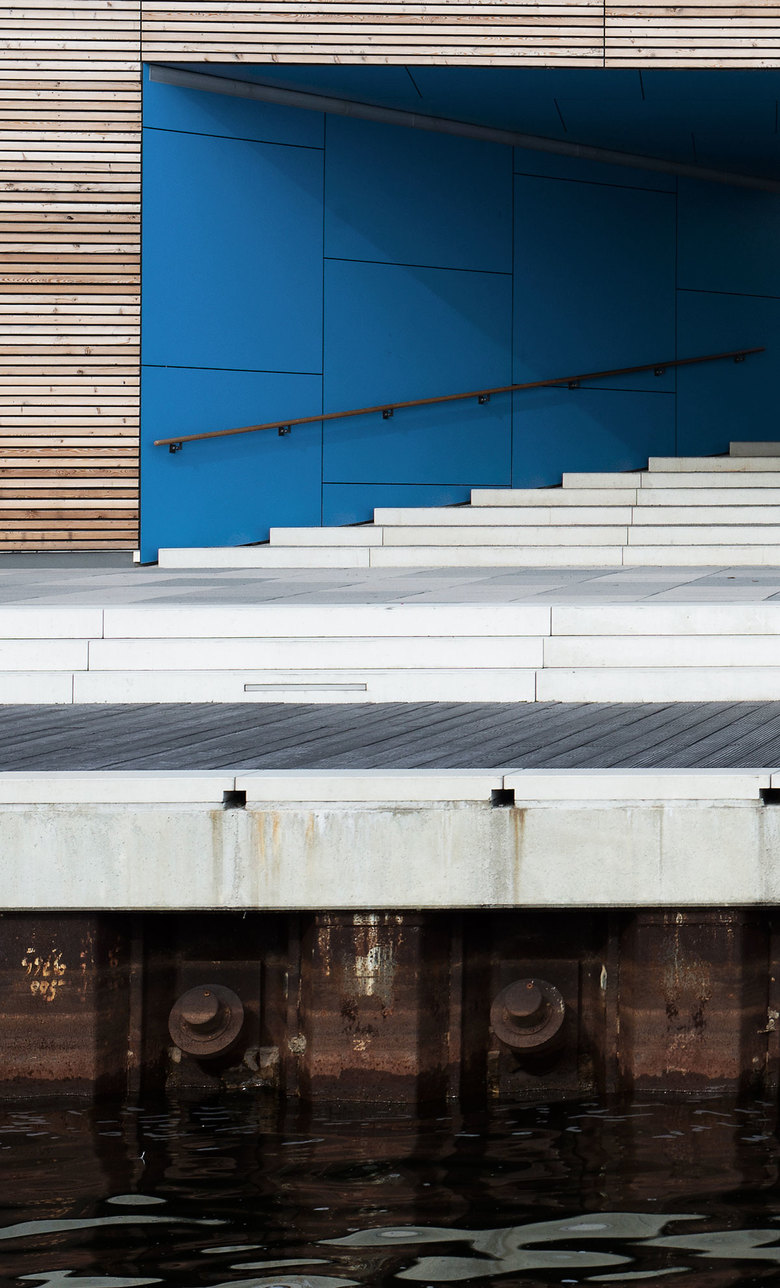 Der Übergangsbereich von Steganlage und fest unterbauter Hafenpromenade sowie die äußere Begrenzung der Steganlage werden durch ein Sockelband aus hochwertigen Weißbetonelementen mit eingeschnittenen Sitzgelegenheiten, Treppen und Rampen flankiert.