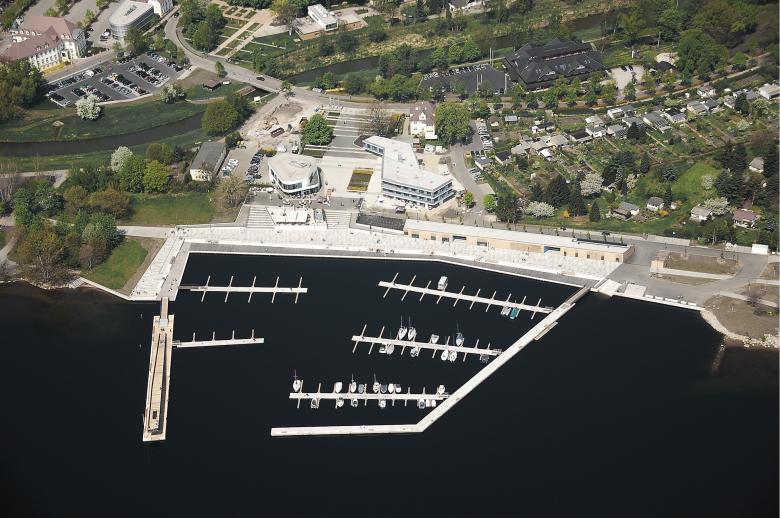 Der Entwurf sieht eine klare gestalterische und funktionale Gliederung der Hafenanlage vor. Schalenförmig angeordnet prägen die topographisch höher gelegenen, städtisch orientierten Entwicklungsflächen und der im Hafenbereich als großzügige Promenade fortgesetzte Uferrundweg das urbane Ufer des Hafens. Als innerste Schale besetzt eine ca, 500 m lange Steganlage (Südwestmole-schwimmend, Nordufer-fest, Ostmole-schwimmend) die Schnittstelle zum See.