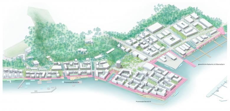Der internationale städtebaulich-freiraumplanerische Wettbewerb setzt die Grundlagen für die Entwicklung eines neuen Stadtteils für ca. 5000 Menschen in Kiel Holtenau. Das zuvor militärisch genutzte MFG 5-Areal soll durch bessere Anbindungen, neue Angebote und gute Benachbarung zu den angrenzenden Ortslagen aus seiner exterritorialen Lage befreit werden. Unser Wettbewerbsbeitrag entwickelt den neuen Stadtteil als mischgenutztes, kompaktes, Quartier zwischen bestehenden Waldflächen des Fördehangs und der neuen Fördepromenade. Die gute Lage nutzen, exponierte Freiräume und landschaftsbezogene Orientierungen für das Stadtquartier schaffen und zugleich geschützte, urbane Räume für die Gemeinschaft im öffentlichen Raum entwickeln, sind die entwurfsleitenden Anliegen. Das Projekt gilt als eines der bedeutendsten städtebaulichen Entwicklungsprojekte der Landeshauptstadt Schleswig-Holsteins. Das Zukunftsquartier soll neue Maßstäbe für die Stadtentwicklung am Wasser, den Klimaschutz, die Energieversorgung, die Mobilität der Zukunft und den Tourismus in der Förderegion setzen. Mit dem Projekt rückt die Stadt näher ans Wasser und erschließt einen neuen, lebenswerten Ort für Alle. Gemeinsam mit unseren Projektpartnern erarbeiten wir zur Zeit die Rahmenplanung und das Qualitätshandbuch - Leitplanke der zukünftigen Quartiersentwicklung.
