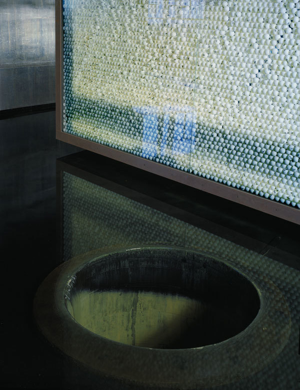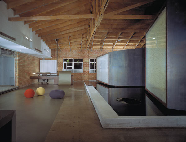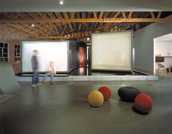 The central design elements are the two oblong skewed boxes hovering over a placid reflecting pool. Hybrids of sculpture and room envelope, the gently curving structures enclose the editing studios and offices. Facing the lobby, the ends present a luminous textured facade, which are revealed on closer inspection to be panels filled respectively with ping-pong balls and acrylic beads. While their materials are unorthodox, the functional result is akin to an Arabic filigreed screen. Bathing the rooms in softly diffused light, they afford the users privacy and minimize distractions while allowing glimpses of the space beyond. The insterstices created by the volumes undulating over the shimmering plane of water evoke Venetian canals and Richard Serra's torqued ellipses. A discreet circular "fountain" sunk into the pool fills the space with soothing sound of running water.